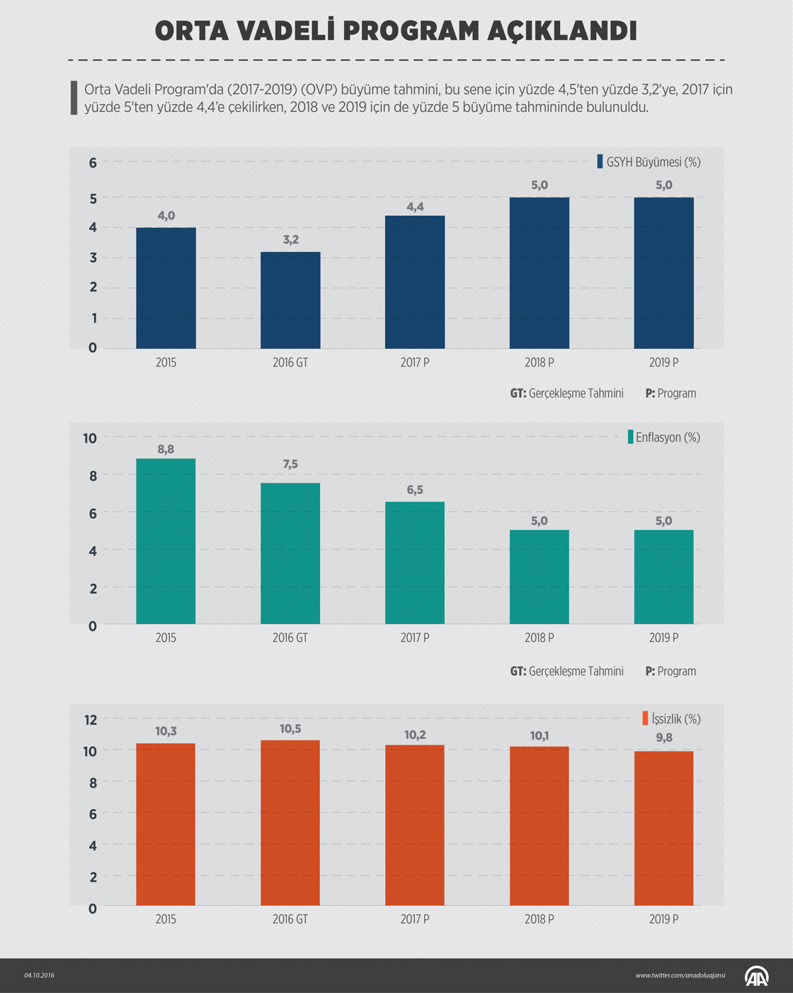 Büyüme tahmini, 2016 için yüzde 4,5'ten yüzde 3,2'ye, 2017 için yüzde 5'ten yüzde 4,4’e çekilirken, 2018 ve 2019 için de yüzde 5 büyüme öngörüldü. Programda, yüzde 7,5 olan yıl sonu enflasyon hedefinde değişikliğe gidilmedi. Enflasyon tahmini 2017'de yüzde 6'dan yüzde 6,5'e revize edilirken, 2018 ve 2019 yıllarında enflasyonun yüzde 5 olarak gerçekleşeceği tahmin edildi. İşsizlik oranı, bu sene için yüzde 10,2'den yüzde 10,5'e, 2017'de yüzde 9,9'dan yüzde 10,2'ye, 2018'de yüzde 9,6'dan yüzde 10,1'e yükseltilirken, işsizliğin 2019'da yüzde 9,8 olacağı öngörüldü. ( Ahmet Burak Özkan - Anadolu Ajansı )04 Ekim 2016•Güncelleme: 05 Ekim 2016