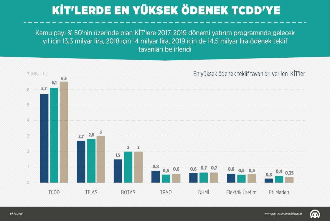 Kalkınma Bakanlığınca yürütülen 2017-2019 dönemi yatırım programı hazırlıklarında Kamu İktisadi Teşebbüsleri (KİT) arasında en yüksek ödenek teklif tavanı 2017 için 5,7 milyar lira ile Türkiye Cumhuriyeti Devlet Demiryolları (TCDD) Genel Müdürlüğüne verildi.07 Ekim 2016•Güncelleme: 10 Ekim 2016