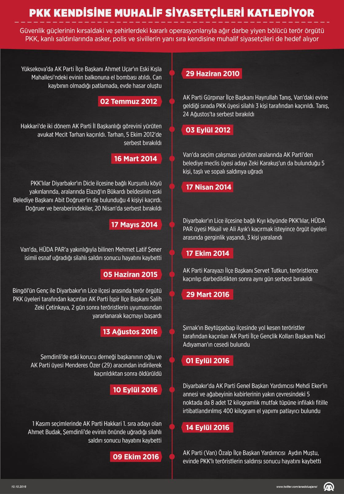 Güvenlik güçlerinin kırsaldaki ve şehirlerdeki kararlı operasyonlarıyla ağır darbe yiyen bölücü terör örgütü PKK, kanlı saldırılarında asker, polis ve sivillerin yanı sıra kendisine muhalif siyasetçileri de hedef alıyor. ( Muhammed Ali Yiğit - Anadolu Ajansı )10 Ekim 2016•Güncelleme: 11 Ekim 2016