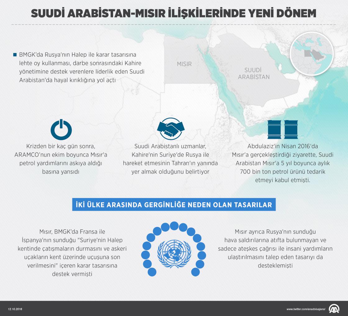 Mısır'ın, Birleşmiş Milletler Güvenlik Konseyi'nde (BMGK) Rusya'nın Suriye ile ilgili karar tasarısına lehte oy kullanması, Mısır'da 2013 yılındaki askeri darbeye destek veren Suudi Arabistan'da hayal kırıklığına yol açtı. ( Yasin Demirci - Anadolu Ajansı )12 Ekim 2016•Güncelleme: 13 Ekim 2016