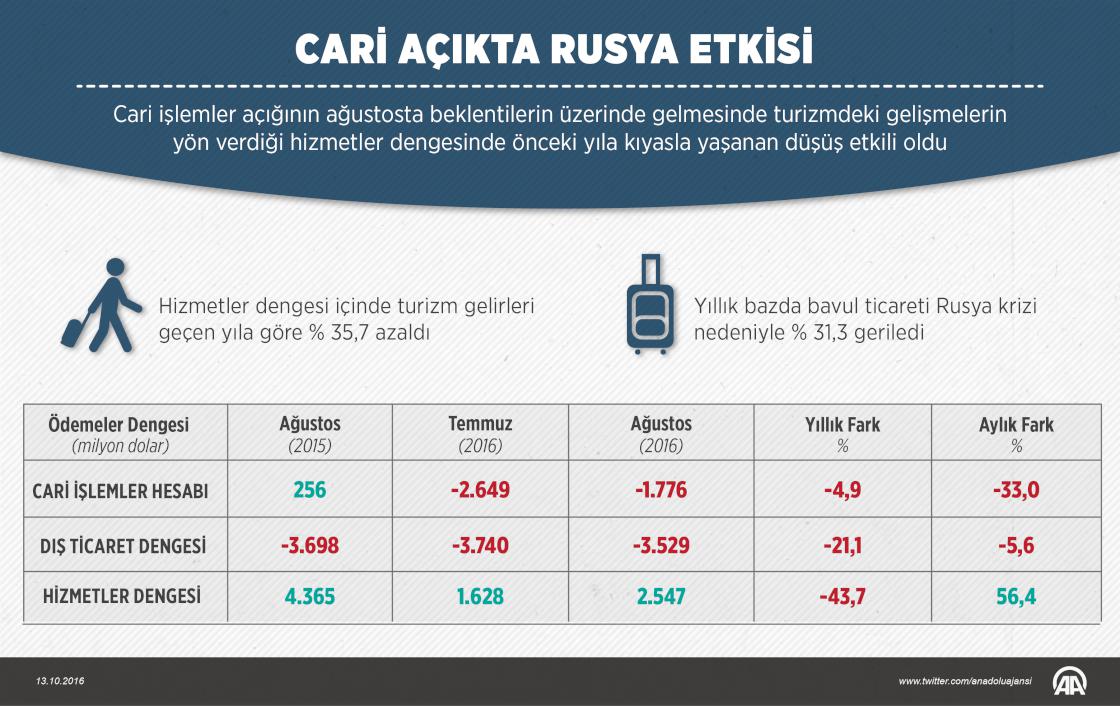Cari işlemler açığının ağustosta beklentilerin üzerinde gelmesinde turizmdeki gelişmelerin yön verdiği hizmetler dengesinde önceki yıla kıyasla yaşanan düşüş etkili oldu. ( Grafik: Muhammed Ali Yiğit - Anadolu Ajansı )