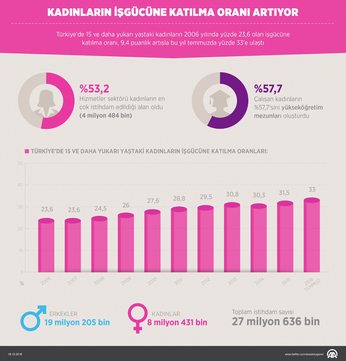 Türkiye'de 15 ve daha yukarı yaştaki kadınların 2006 yılında yüzde 23,6 olan iş gücüne katılma oranı, 9,4 puanlık artışla bu yıl temmuzda yüzde 33'e ulaştı. ( Yasin Demirci - Anadolu Ajansı )