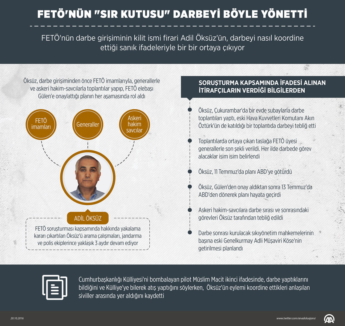 Fetullahçı Terör Örgütü'nün (FETÖ) darbe girişimine yönelik soruşturmada Akıncı Üssü'nde gözaltına alındıktan sonra salıverilen, girişimin kilit ismi firari Adil Öksüz'ün darbeyi nasıl koordine ettiği sanık ifadeleriyle ortaya çıkıyor. İtirafçıların verdiği bilgilere göre Öksüz, girişimden önce FETÖ imamları ile generaller, askeri hakim ve savcılarla toplantılar yapıp darbe planını hazırladı. ( Ahmet Burak Özkan - Anadolu Ajansı )20 Ekim 2016•Güncelleme: 21 Ekim 2016