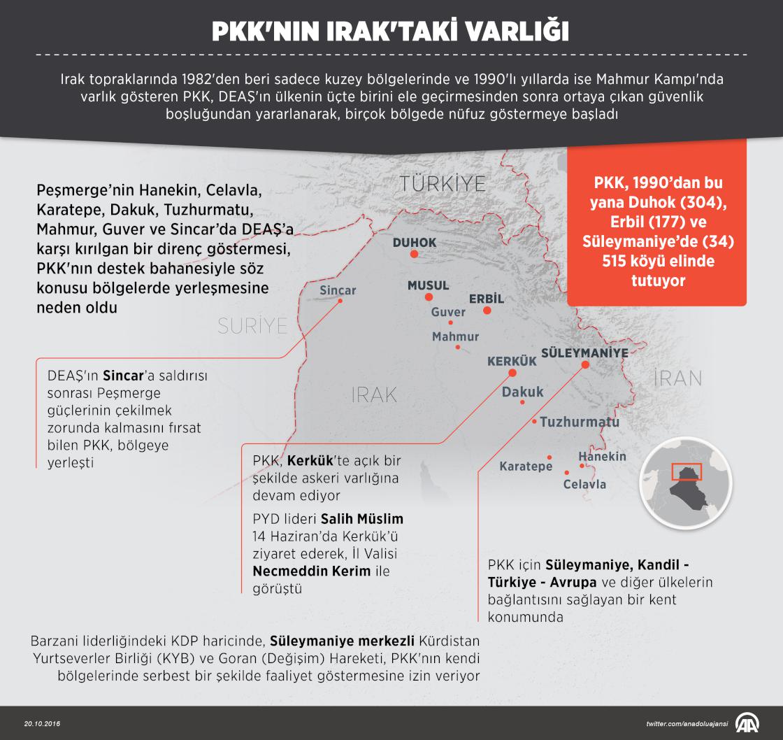 Irak topraklarında 1982'den beri sadece kuzey bölgelerinde ve 1990'lı yıllarda ise Mahmur Kampı'nda varlık gösteren PKK, DEAŞ'ın ülkenin üçte birini ele geçirmesinden sonra ortaya çıkan güvenlik boşluğundan yararlanarak, birçok bölgede nüfuz göstermeye başladı. ( Murat Usubaliev - Anadolu Ajansı )21 Ekim 2016•Güncelleme: 24 Ekim 2016