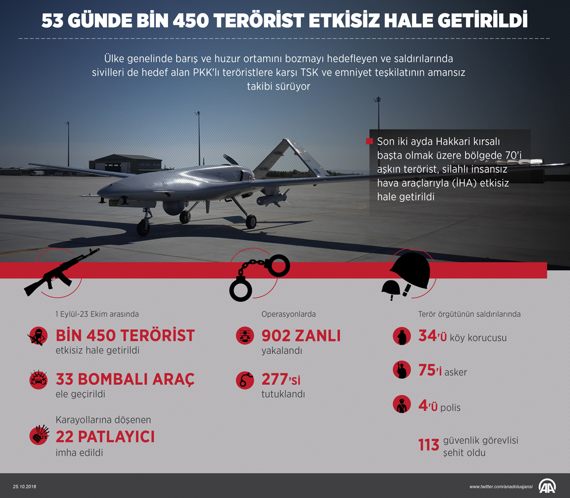 Ülke genelinde barış ve huzur ortamını bozmayı hedefleyen ve saldırılarında sivilleri de hedef alan PKK'lı teröristlere karşı TSK ve emniyet teşkilatının amansız takibi sürüyor. Son iki ayda Hakkari kırsalı başta olmak üzere bölgede 70'i aşkın terörist, silahlı insansız hava araçlarıyla (İHA) etkisiz hale getirildi. ( Yasin Demirci - Anadolu Ajansı )25 Ekim 2016•Güncelleme: 26 Ekim 2016