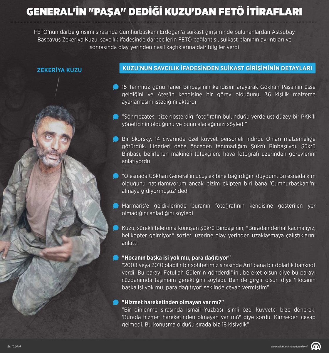 FETÖ’nün darbe girişimi sırasında Cumhurbaşkanı Erdoğan'a suikast girişiminde bulunanlardan Astsubay Başçavuş Zekeriya Kuzu, savcılık ifadesinde darbecilerin FETÖ bağlantısı, suikast planının ayrıntıları ve sonrasında olay yerinden nasıl kaçtıklarına dair bilgiler verdi. ( Yasin Demirci - Anadolu Ajansı )26 Ekim 2016•Güncelleme: 27 Ekim 2016