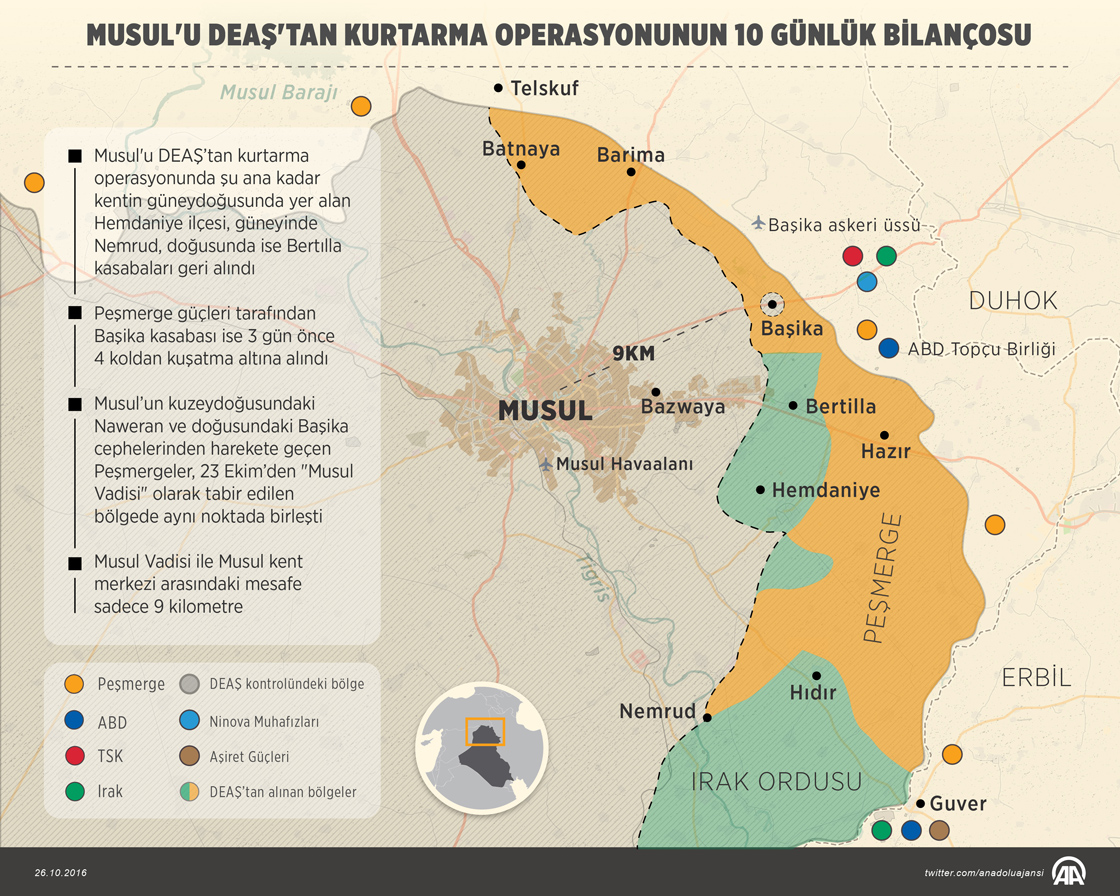 Irak'ta terör örgütü DEAŞ'ın elinde tuttuğu Musul'u kurtarma operasyonu 10'uncu gününde devam ediyor. Irak ordusu ve Peşmerge güçlerinin ortak başlatıp, uluslararası koalisyon güçlerinin destek verdiği operasyonda şu ana kadar kentin güneydoğusunda yer alan Hemdaniye ilçesi, güneyinde Nemrud, doğusunda ise Bertılla kasabaları geri alındı. Ordu ve Peşmerge güçleri şu ana kadar 30'un üzerinde köyün geri alındığını açıkladı. ( Ahmet Burak Özkan - Anadolu Ajansı )26 Ekim 2016•Güncelleme: 27 Ekim 2016