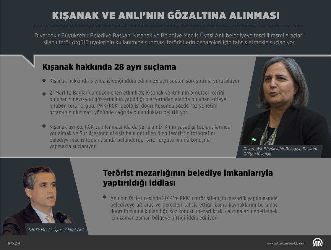 Diyarbakır Cumhuriyet Başsavcılığınca yürütülen terör soruşturması kapsamında gözaltına alınan Diyarbakır Büyükşehir Belediye Başkanı Gültan Kışanak ve DBP'li Belediye Meclis Üyesi Fırat Anlı, belediyeye ait resmi araçları silahlı terör örgütü üyelerinin kullanımına sunmak ve araçları teröristlerin cenazeleri için tahsis etmekle suçlanıyor. ( Gözde Gültekinler - Anadolu Ajansı )26 Ekim 2016•Güncelleme: 27 Ekim 2016