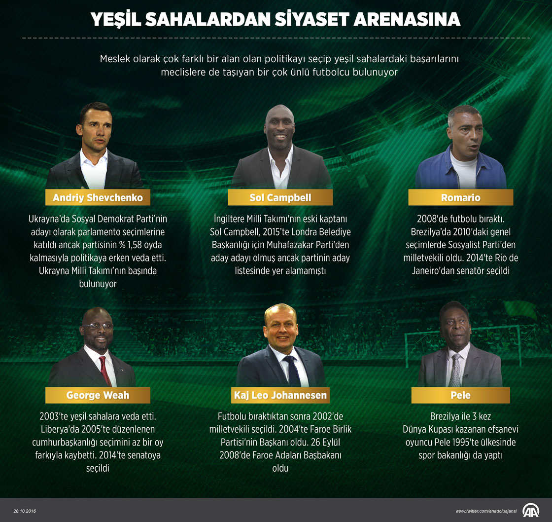 Futbol oynarken ya da futbolu bıraktıktan sonra, meslek olarak çok farklı bir alan olan politikayı seçip yeşil sahalardaki başarısını meclislere de taşıyan birçok ünlü isim bulunuyor. ( Yasin Demirci - Anadolu Ajansı )