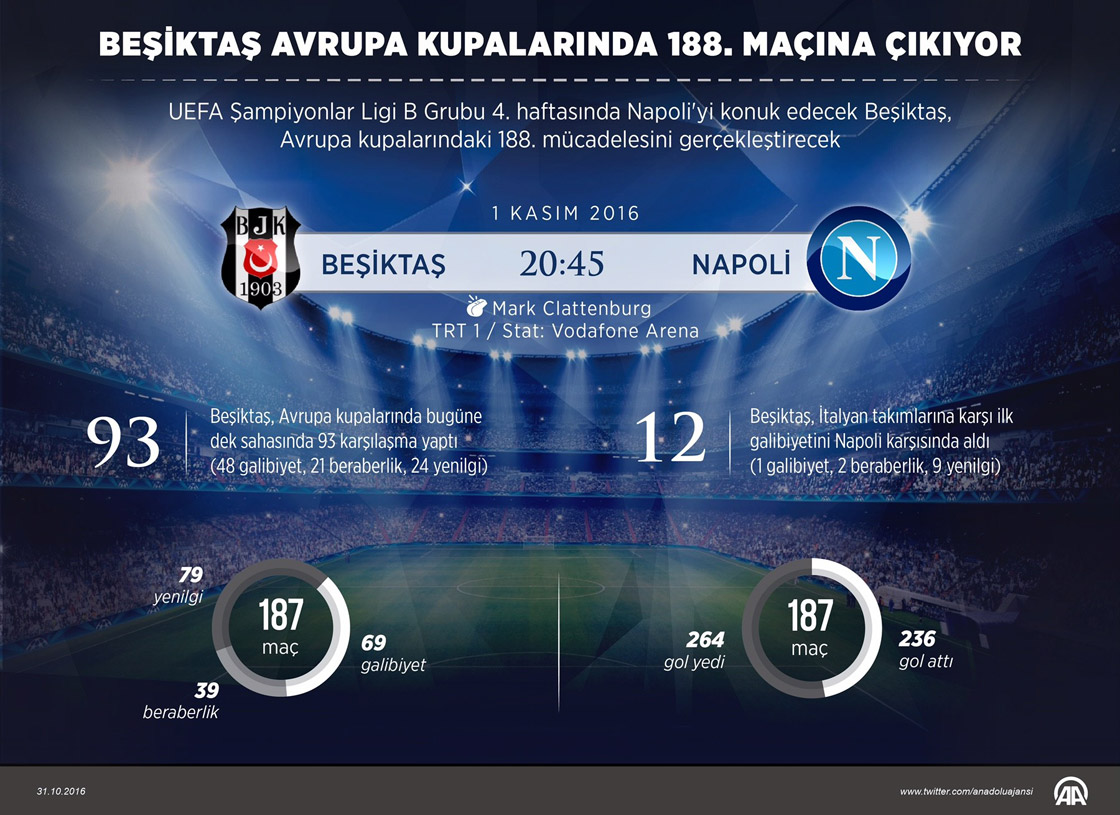 UEFA Şampiyonlar Ligi B Grubu dördüncü haftasında yarın İtalya temsilcisi Napoli'yi konuk edecek Beşiktaş, Avrupa kupalarındaki 188. mücadelesine çıkacak. ( Muhammed Ali Yiğit - Anadolu Ajansı )