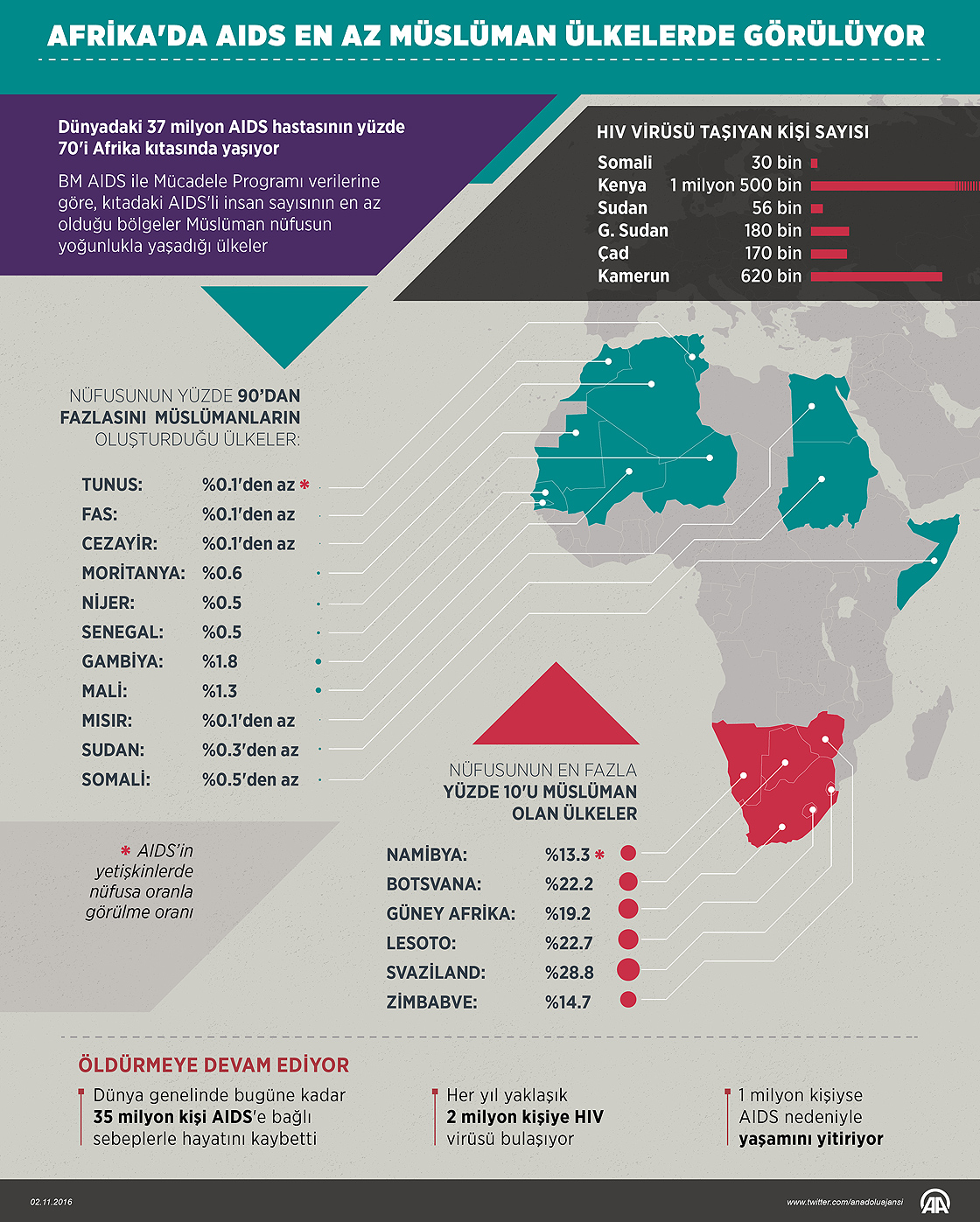 Dünyada AIDS (Edinilmiş Bağışıklık Eksikliği Sendromu) hastalığının en fazla görüldüğü Afrika kıtasında, Müslüman nüfusun ağırlıkta olduğu ülkeler hastalıktan en az etkileniyor. AA muhabirinin, Birleşmiş Milletler AIDS ile Mücadele Programı (UNAIDS) verilerinden derlediği bilgilere göre, dünyada AIDS'e neden olan İnsan Bağışıklık Yetmezliği Virüsü ile (HIV) hayatını sürdüren yaklaşık 37 milyon kişi bulunurken, bunların yaklaşık yüzde 70'i Afrika ülkelerinde yaşıyor. ( Murat Usubaliev - Anadolu Ajansı )02 Kasım 2016•Güncelleme: 03 Kasım 2016