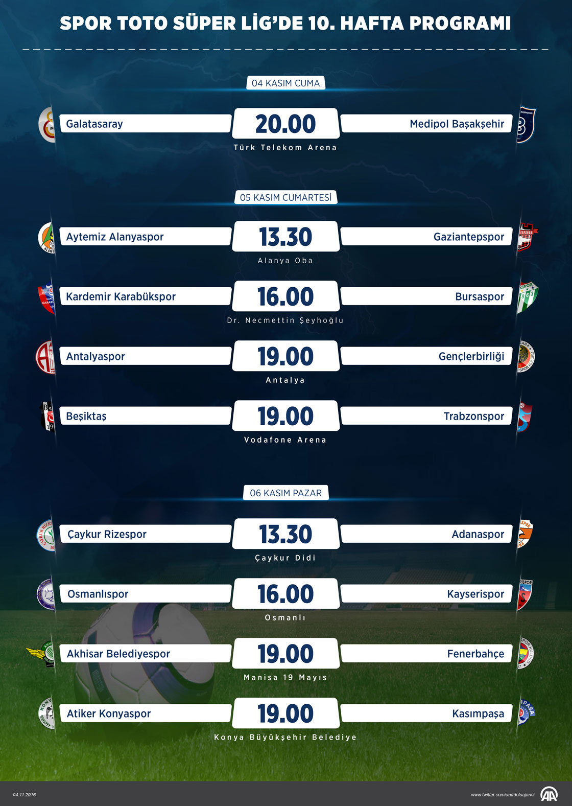 Spor Toto Süper Lig'de 10. haftanın açılış maçında bugün Galatasaray ile Medipol Başakşehir karşı karşıya gelecek. 10. hafta maçlarında 5 Kasım Cumartesi günü 4, 6 Kasım Pazar günü 4 maç oynanacak.
