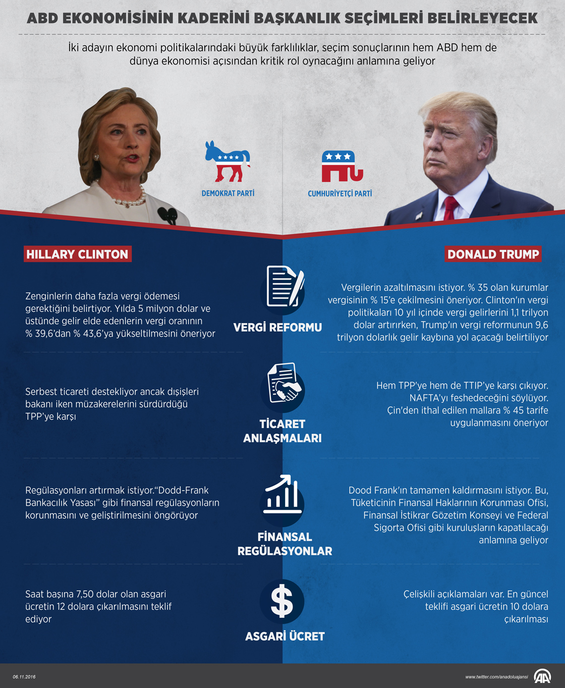 ABD'de salı günü yapılacak başkanlık seçimlerinden kimin zaferle çıkacağı dünyanın en büyük ekonomisinin geleceğini de belirleyecek. Cumhuriyetçi Donald Trump’ın başkan seçilmesi ekonomide radikal değişimler yaşanmasına, Demokrat Hillary Clinton’ın galip gelmesi ise statükonun devam etmesine yol açacak. ( Muhammed Ali Yiğit - Anadolu Ajansı )06 Kasım 2016•Güncelleme: 07 Kasım 2016