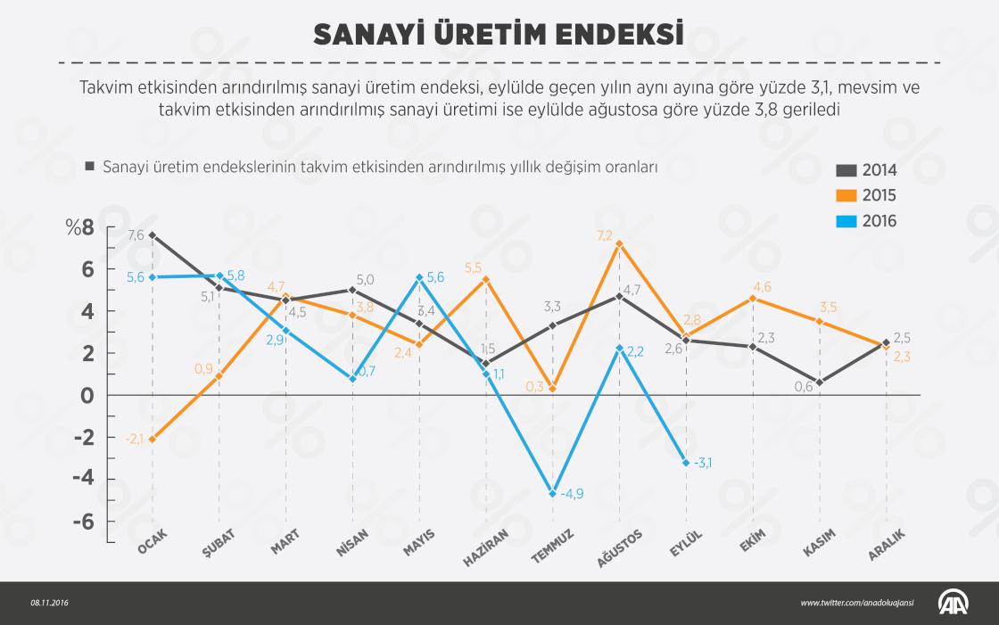 Takvim etkisinden arındırılmış sanayi üretim endeksi, eylülde geçen yılın aynı ayına göre yüzde 3,1, mevsim ve takvim etkisinden arındırılmış sanayi üretimi ise eylülde ağustosa göre yüzde 3,8 geriledi. ( Ahmet Burak Özkan - Anadolu Ajansı )
