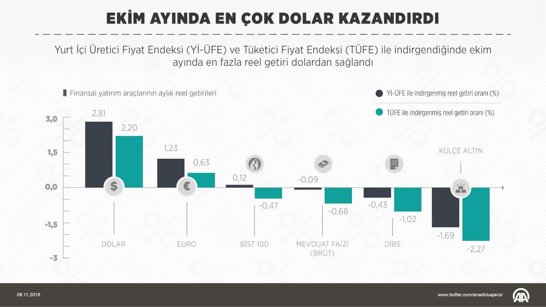 Türkiye İstatistik Kurumu (TÜİK), finansal yatırım araçlarının ekim ayına ilişkin reel getiri oranlarını açıkladı. Buna göre, geçen ay en yüksek reel getiri, Yİ-ÜFE ile indirgendiğinde yüzde 2,81, TÜFE ile indirgendiğinde yüzde 2,2 ile dolarda gerçekleşti. Yİ-ÜFE ile indirgendiğinde yatırım araçlarından avro yüzde 1,23, BIST 100 Endeksi yüzde 0,12 reel getiri sağladı. Buna karşılık, mevduat faizi yüzde 0,09, DİBS yüzde 0,43 ve külçe altın yüzde 1,69 oranında yatırımcısına kaybettirdi. TÜFE ile indirgendiğinde avro yüzde 0,63 reel getiri sağlarken, BIST 100 Endeksi yüzde 0,47, mevduat faizi yüzde 0,68, DİBS yüzde 1,02 ve külçe altın yüzde 2,27 kaybettirerek yatırımcısını üzdü. ( Ahmet Burak Özkan - Anadolu Ajansı )09 Kasım 2016•Güncelleme: 10 Kasım 2016