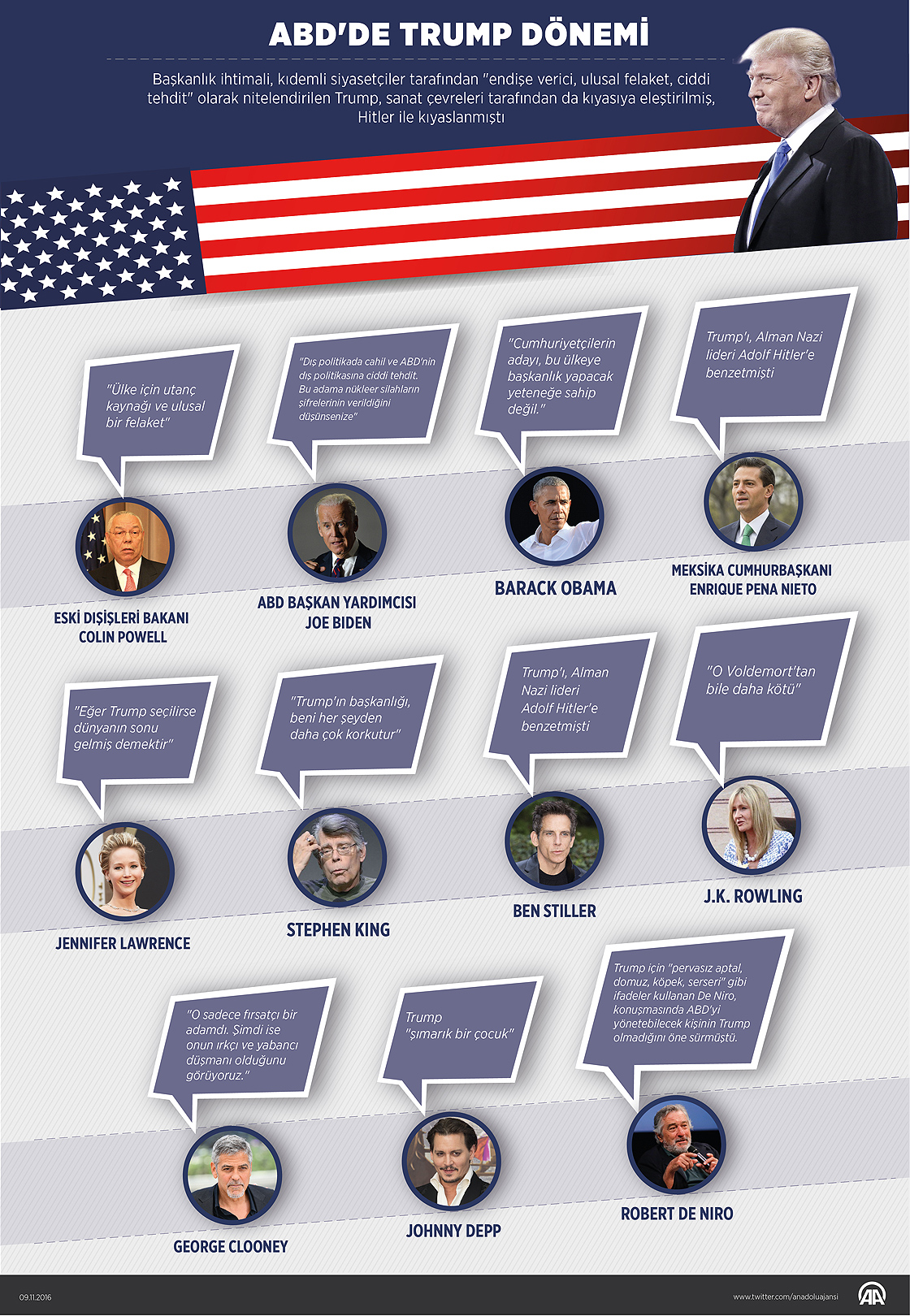 Söylemleri nedeniyle birçok ünlü ve siyasetçinin eleştiri oklarının ve hakarete varan sözlerinin hedefi olan Trump'ın başkanlığı döneminde de tartışmaların devam etmesi bekleniyor. Başkanlık ihtimali, kıdemli siyasetçiler tarafından "endişe verici, ulusal felaket, ciddi tehdit" olarak nitelendirilen Trump, sanat çevreleri tarafından da kıyasıya eleştirilmiş, Alman Nazi lideri Adolf Hitler ile kıyaslanmıştı. ( Gözde Gültekinler - Anadolu Ajansı )09 Kasım 2016•Güncelleme: 10 Kasım 2016