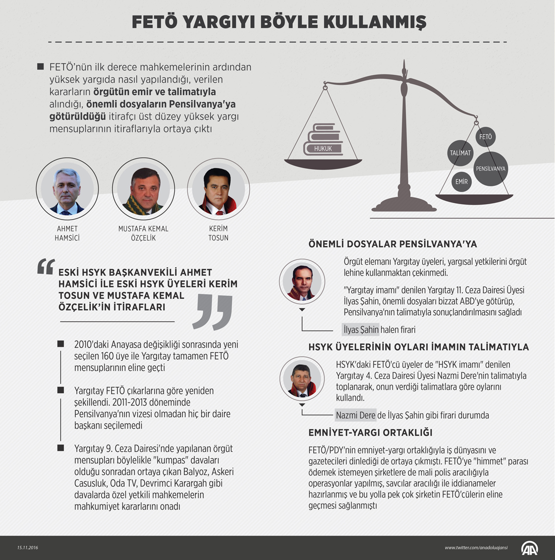 Fetullahçı Terör Örgütü'nün (FETÖ) ilk derece mahkemelerinin ardından yüksek yargıda nasıl yapılandığı, verilen kararların örgütün emir ve talimatıyla alındığı, önemli dosyaların Pensilvanya'ya götürüldüğü itirafçı üst düzey yüksek yargı mensuplarının itiraflarıyla ortaya çıktı. Darbe girişiminin ardından tutuklanan eski Hakimler ve Savcılar Yüksek Kurulu (HSYK) Başkanvekili Ahmet Hamsici ile HSYK üyeleri Kerim Tosun ve Mustafa Kemal Özçelik itirafçı oldu. ( Ahmet Burak Özkan - Anadolu Ajansı )15 Kasım 2016•Güncelleme: 16 Kasım 2016