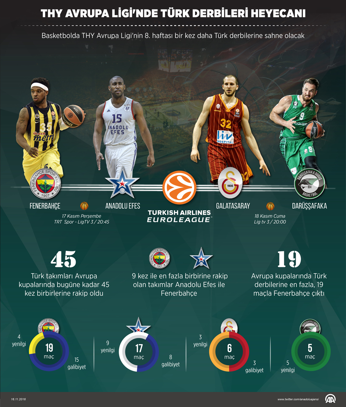 Basketbolda THY Avrupa Ligi'nin 8. haftası bir kez daha Türk derbilerine sahne olacak.