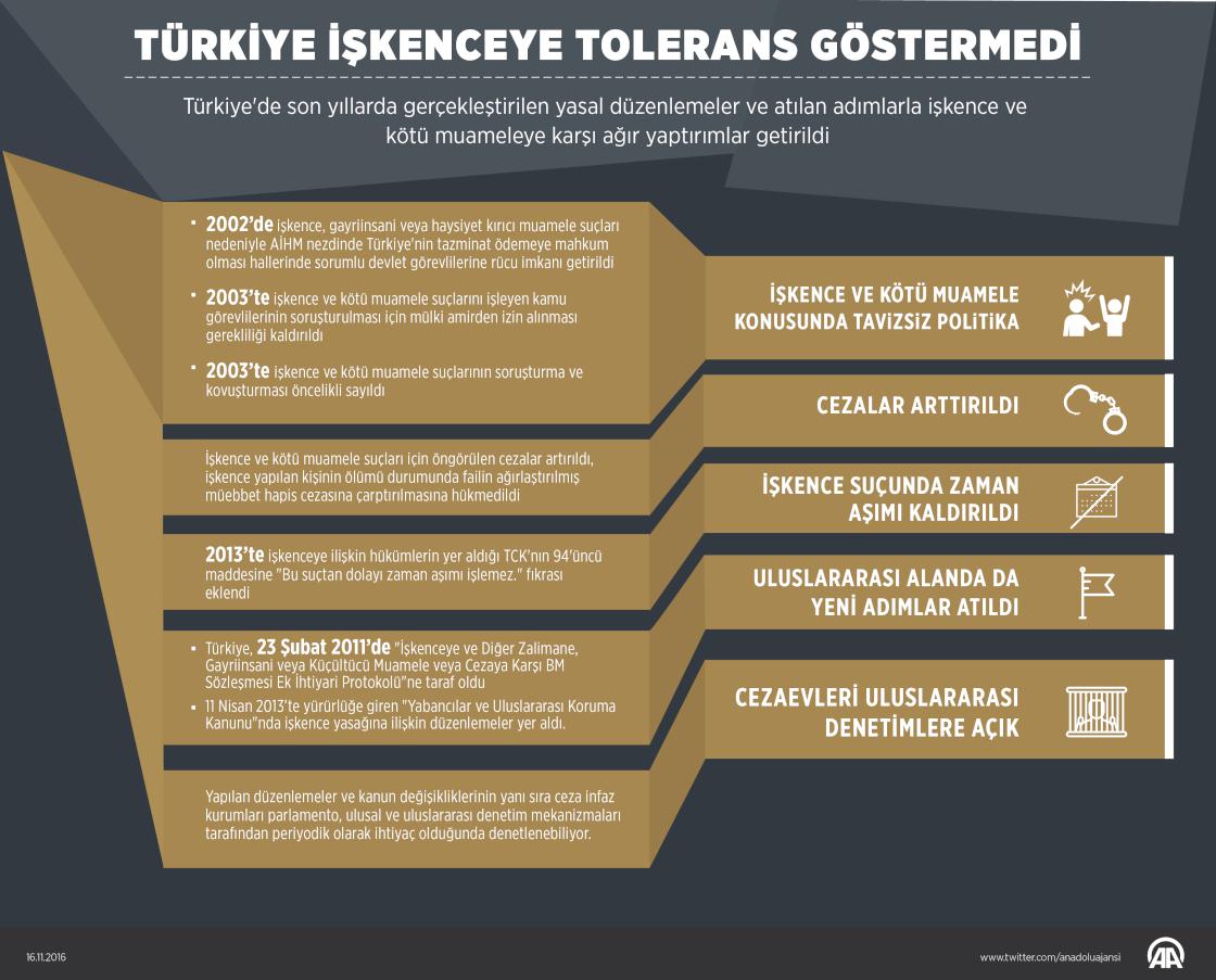 Türkiye'de, son yıllarda gerçekleştirilen yasal düzenlemeler ve atılan adımlarla, işkence ve kötü muameleye karşı ağır yaptırımlar getirildi. AA muhabirinin, Adalet Bakanlığı İnsan Hakları Daire Başkanlığı yetkililerinden aldığı bilgiye göre, işkence ve kötü muamele ile mücadele için yeni adımlar atıldı. İşkence ve kötü muameleye karşı getirilen çeşitli yaptırımlar ve yasal düzenlemelerle "işkenceye sıfır tolerans" politikası hayata geçirildi. ( Gözde Gültekinler - Anadolu Ajansı )16 Kasım 2016•Güncelleme: 17 Kasım 2016