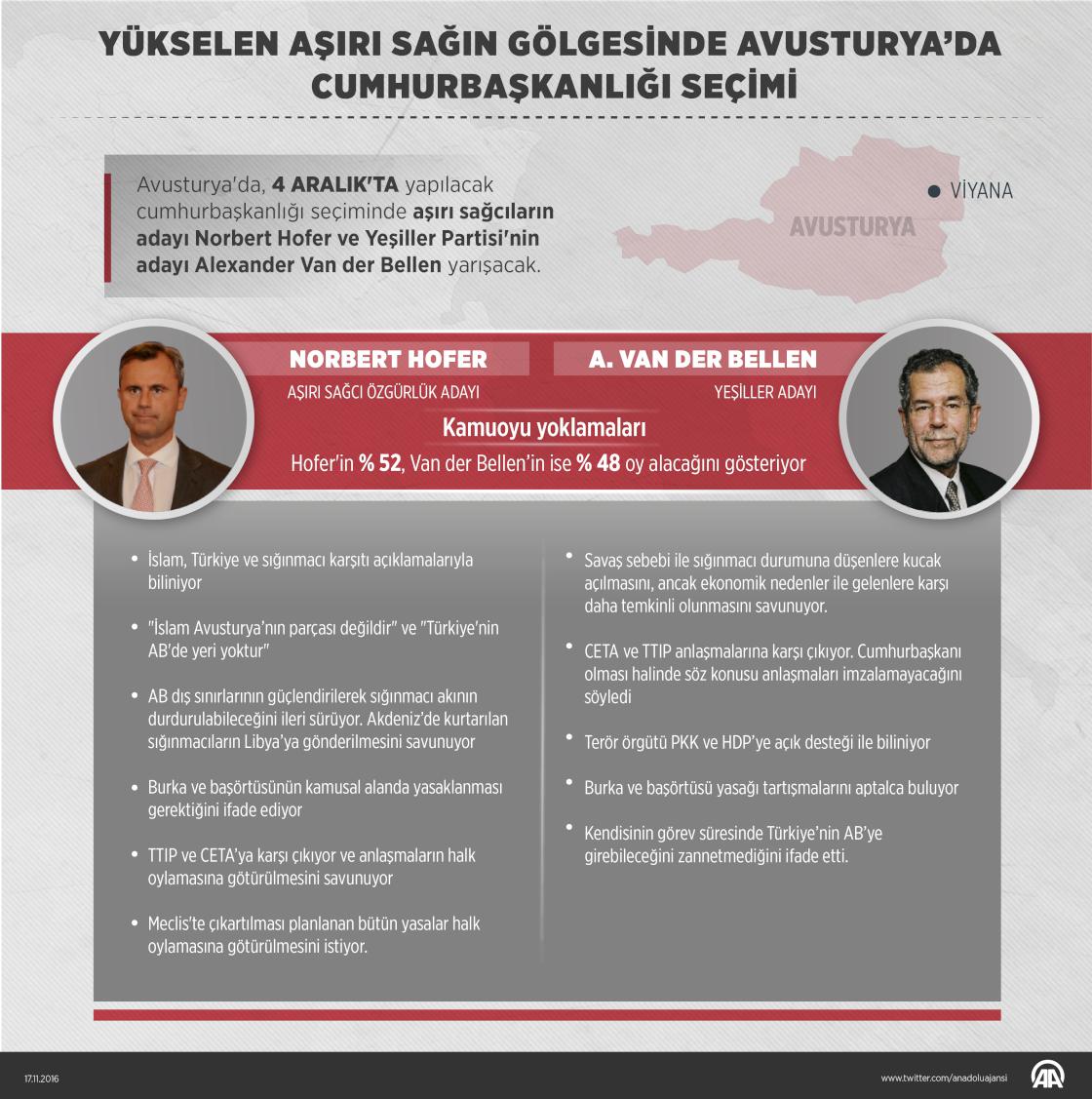 Avusturya'da 4 Aralık'ta yapılacak cumhurbaşkanlığı seçiminde aşırı sağcıların adayı Norbert Hofer ve Yeşiller Partisinin adayı Alexander Van der Bellen yarışacak. Yaklaşık 15 yıldır koalisyonla yönetilen Avusturya, Sosyal Demokrat Parti (SPÖ) ve Halk Partisinin (ÖVP) oluşturduğu koalisyon hükümeti ile yönetiliyor. Cumhurbaşkanlığı seçimlerinin ilk turunda koalisyon partilerinin adaylarının saf dışı kalmaları, aşırı sağcı Avusturya Özgürlük Partisinin (FPÖ) adayı Norbert Hofer ve Yeşiller Partisinin (Grüne) adayı Alexander Van der Bellen'in karşı karşıya kalmasına neden oldu.