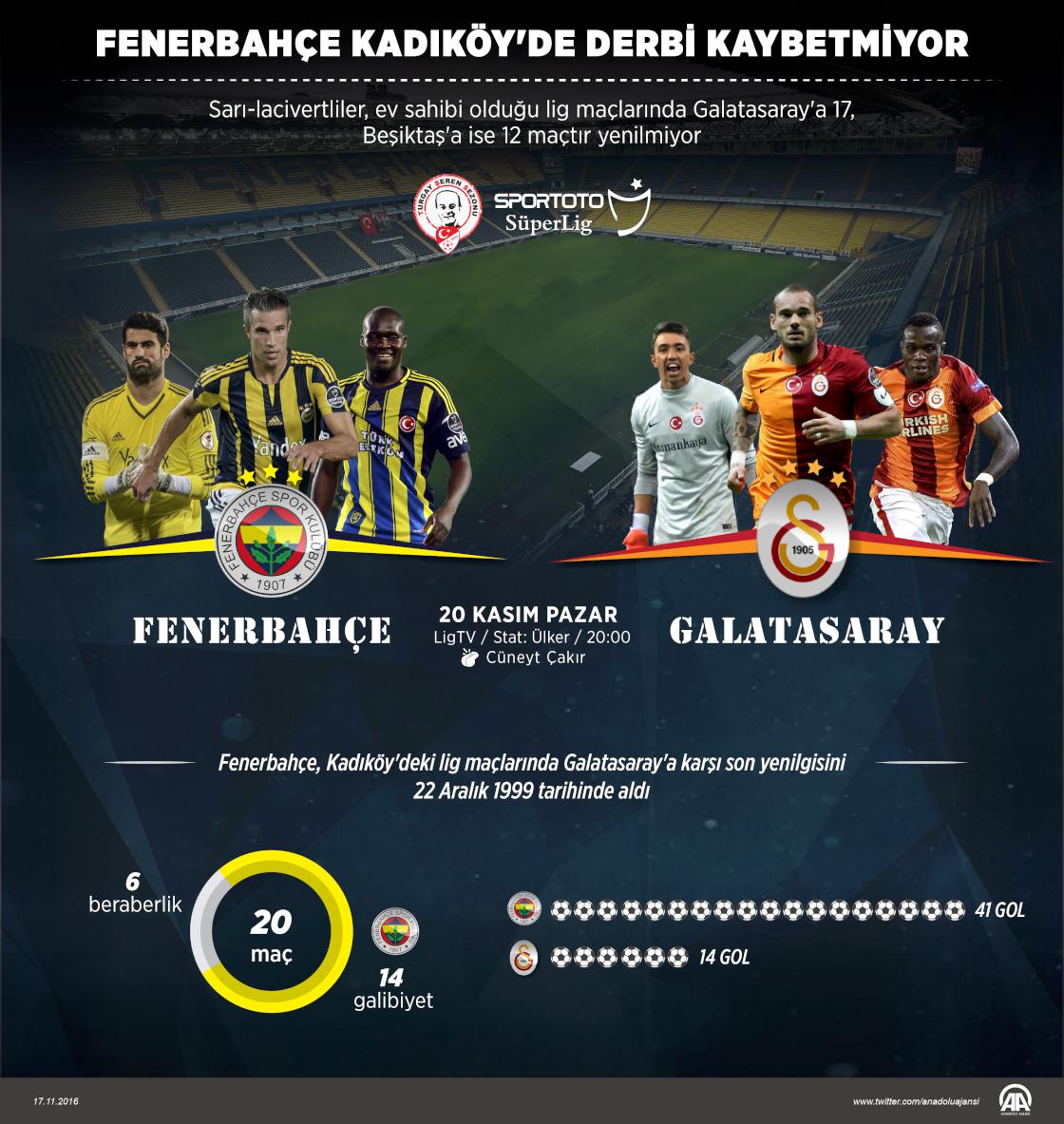 Spor Toto Süper Lig'de 20 Kasım Pazar günkü derbi öncesi Galatasaray, Kadıköy'de 17 yıla yakın süredir Fenerbahçe'yi yenemiyor. ( Muhammed Ali Yiğit - Anadolu Ajansı )