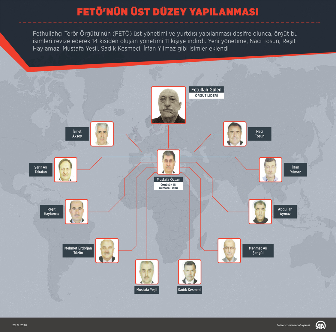 Fetullahçı Terör Örgütü'nün (FETÖ) üst yönetimi ve yurt dışı yapılanması deşifre olunca, örgüt bu isimleri revize ederek 14 kişiden oluşan yönetimi 11 kişiye indirdi. Yeni yönetime, Naci Tosun, Reşit Haylamaz, Mustafa Yeşil, Sadık Kesmeci, İrfan Yılmaz gibi isimler eklendiği öğrenildi. ( Anadolu Ajansı )20 Kasım 2016•Güncelleme: 21 Kasım 2016