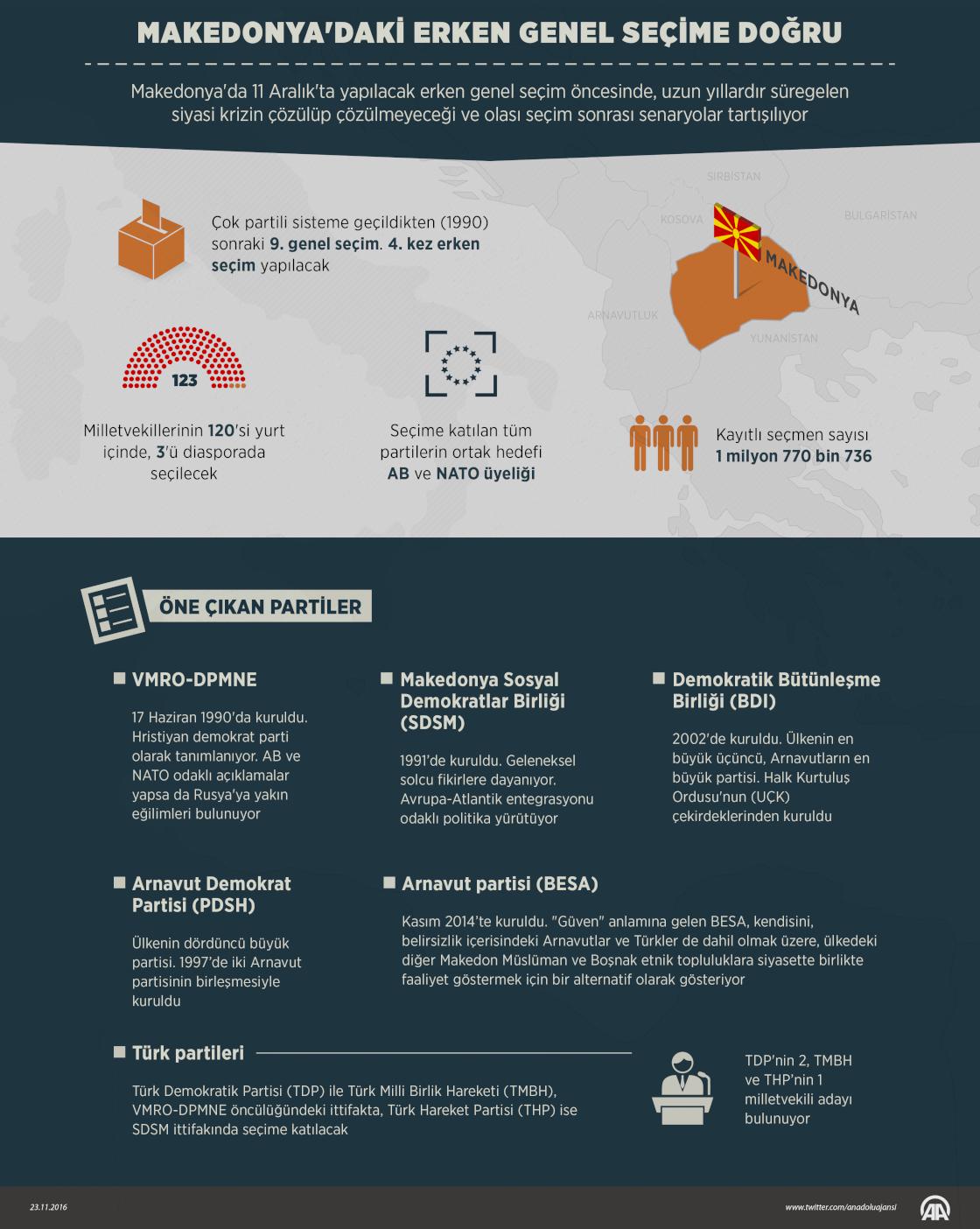 Makedonya'da 11 Aralık'ta yapılacak erken genel seçim için kampanyalar devam ederken, uzun yıllardır süregelen siyasi krizin çözülüp çözülmeyeceği ve seçim sonrası olası senaryolar da tartışılmaya devam ediyor. Ülkede kökleri eskiye dayan siyasi kriz, 2014 yılındaki erken genel seçimin ardından SDSM önderliğinde muhalefet kanadının seçim sonuçlarını kabul etmemesiyle derinleşti. ( Ahmet Burak Özkan - Anadolu Ajansı )23 Kasım 2016•Güncelleme: 24 Kasım 2016