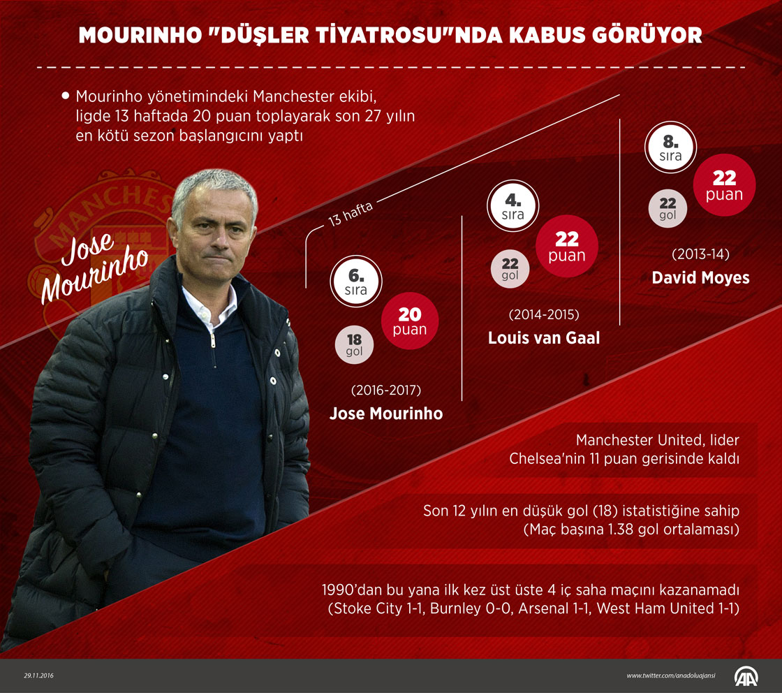 Manchester United, ligde 13 haftada 20 puan toplayarak son 27 yılın en kötü sezon başlangıcını yaptı. Moyes ve Van Gaal'den sonra takımı eski düzeyine çıkarması için getirilen Mourinho yönetimindeki kırmızı-beyazlılar, 1990 yılından bu yana ilk kez üst üste 4 iç saha maçını kazanamadı. ( Ahmet Burak Özkan - Anadolu Ajansı )29 Kasım 2016•Güncelleme: 29 Kasım 2016