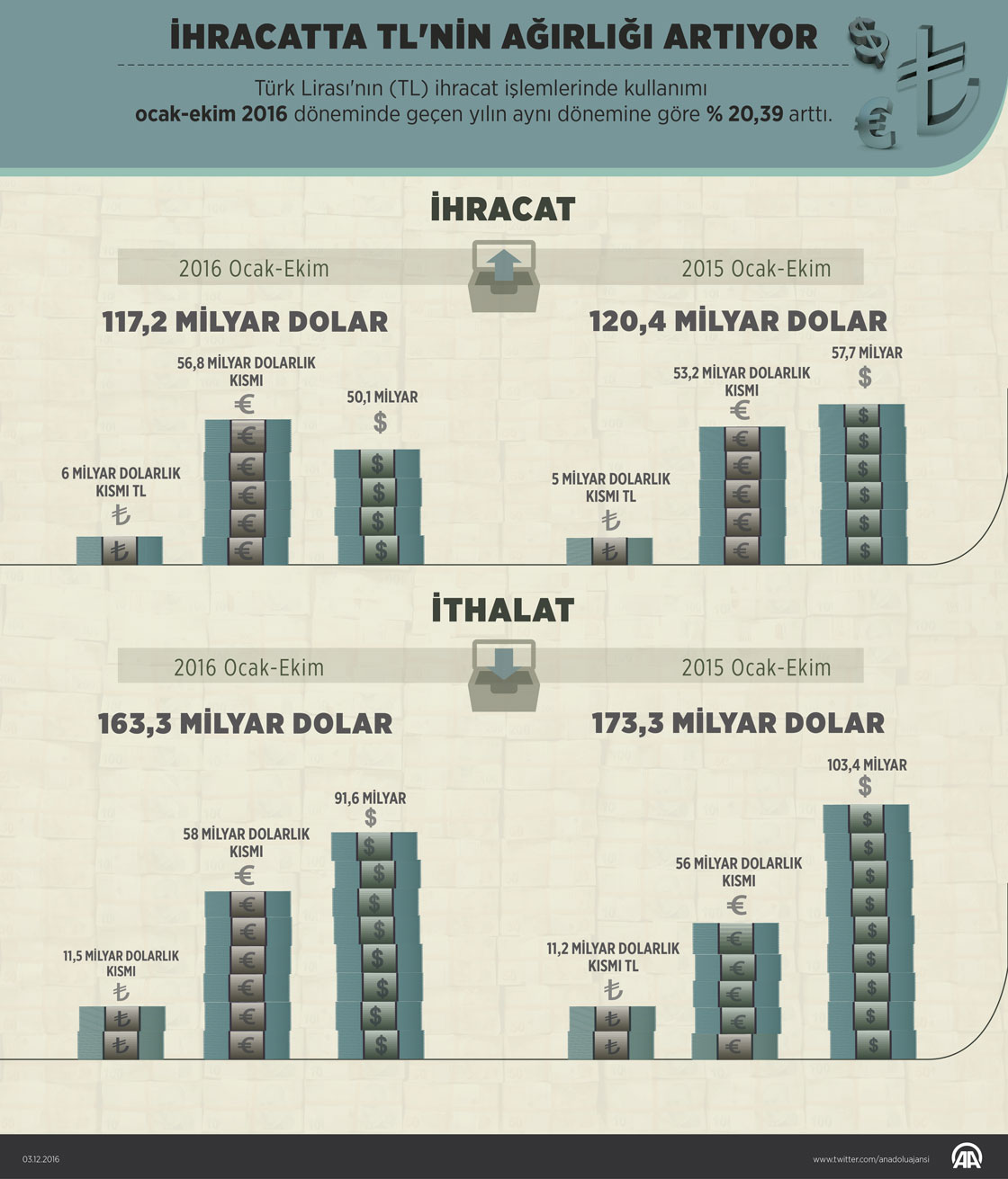 Türk lirasının (TL) ihracat işlemlerinde kullanımı Ocak-Ekim 2016 döneminde geçen yılın aynı dönemine göre yüzde 20,39 arttı. AA muhabirinin Türkiye İstatistik Kurumu (TÜİK) verilerinden derlediği bilgilere göre, Türkiye, bu yılın 10 ayında 117 milyar 20 milyon 967 bin dolar tutarında ihracat gerçekleştirdi. Söz konusu ihracatın 5 milyar 966 milyon 591 bin dolarlık kısmı TL karşılığında yapıldı. ( Gözde Gültekinler - Anadolu Ajansı )03 Aralık 2016•Güncelleme: 03 Aralık 2016