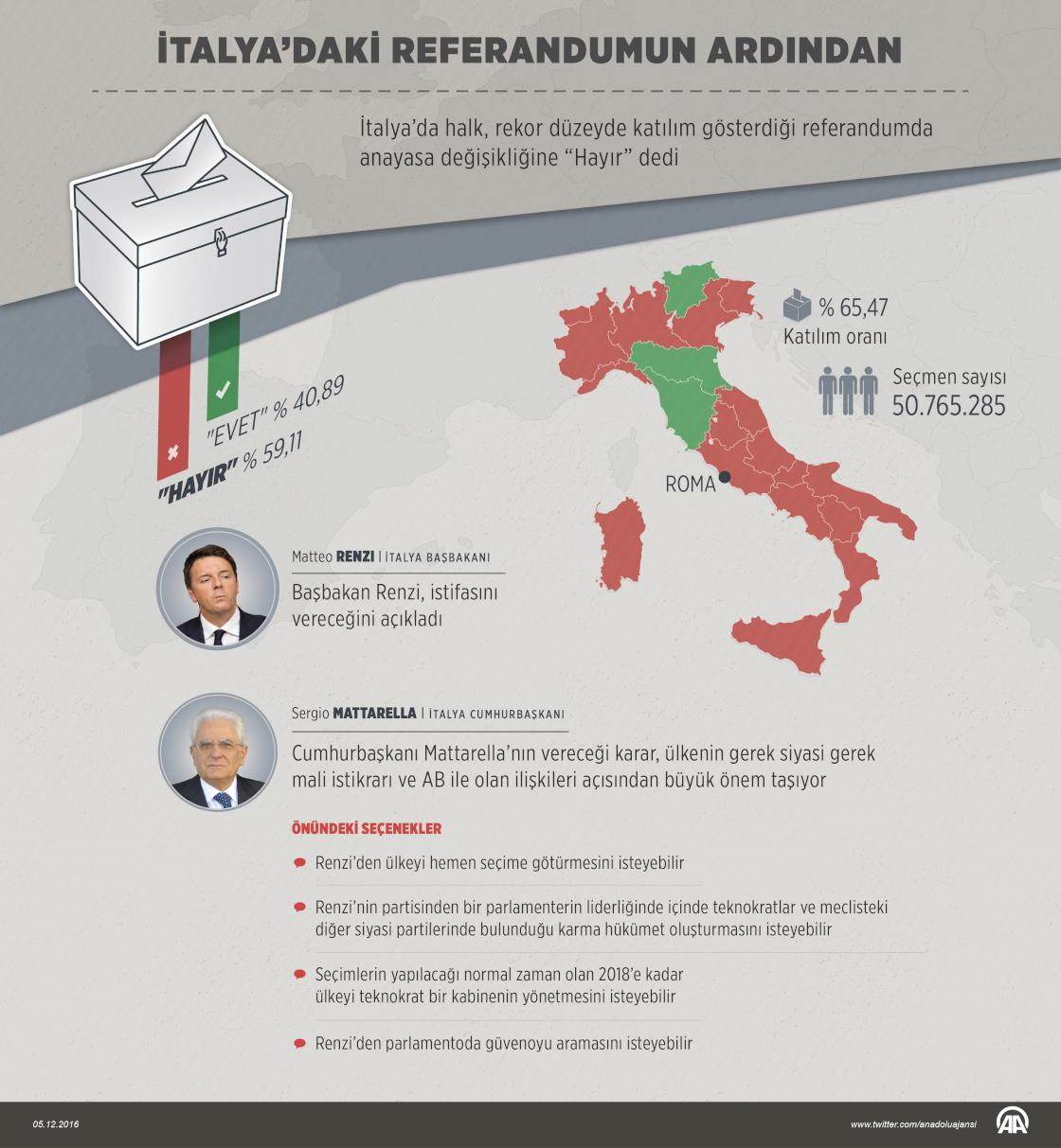 İtalya’da halk, rekor düzeyde katılım gösterdiği referandumda anayasa değişikliğine “Hayır” dedi. Çift meclisli yasama sisteminin geçerli olduğu ülkede, parlamentonun üst kanadı Cumhuriyet Senatosunun yasama yetkilerini ciddi ölçüde törpüleyerek yasama sürecini hızlandırmayı hedefleyen ve toplam 47 maddede değişiklik öngören anayasa reformuna yönelik dün yapılan referandumda resmi sonuçlar belli oldu. Seçmen kütüğüne kayıtlı yaklaşık 51 milyon seçmenin yüzde 65,47'si sandık başına gitti. Anayasa değişikliği reformuna “Evet” oyu verenler, yüzde 40,89’da kaldı, “Hayır” oyları ise yüzde 59,11 çıktı. ( Ahmet Burak Özkan - Anadolu Ajansı )05 Aralık 2016•Güncelleme: 05 Aralık 2016