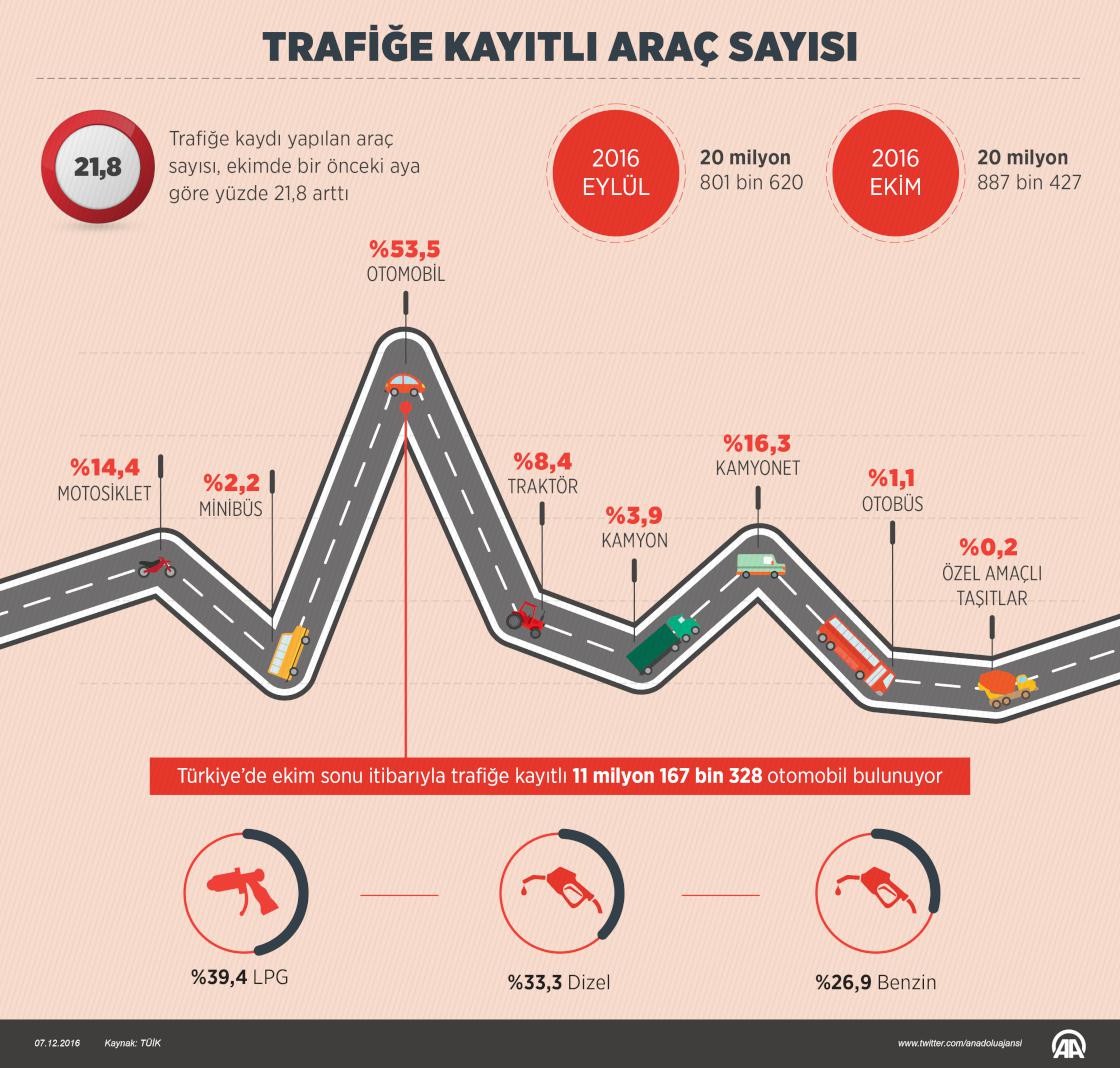 Trafiğe kayıtlı araç sayısı, eylülde bir önceki aya göre yüzde 21,8 artarak 20 milyon 887 bin 427'ye çıktı. ( Murat Usubaliev - Anadolu Ajansı )