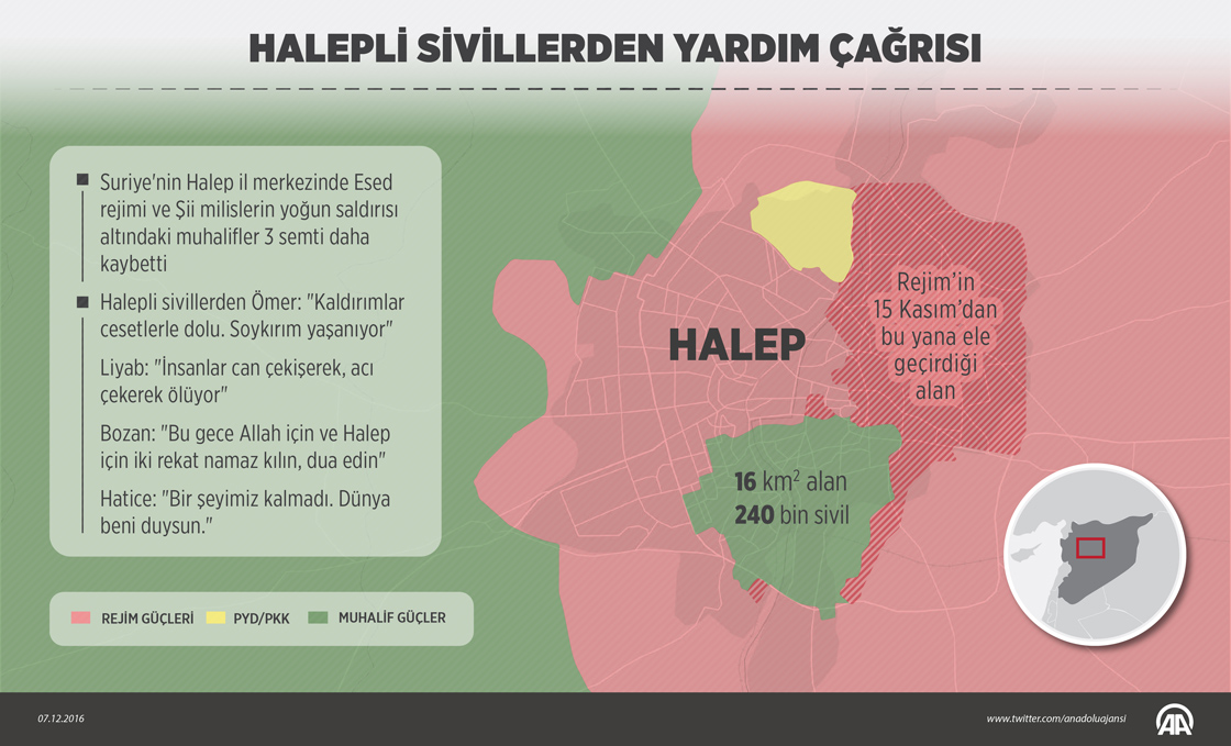 Suriye'nin Halep il merkezinde Esed rejimi ve Şii milislerin yoğun saldırısı altındaki muhalifler 3 semti daha kaybetti. Muhaliflerin ellerinde kalan 16 kilometrekarede 240 bin sivil yaşıyor. 3 aydır abluka ve bombardımanda olan Halepli siviller dünyaya çağrı yaptı.