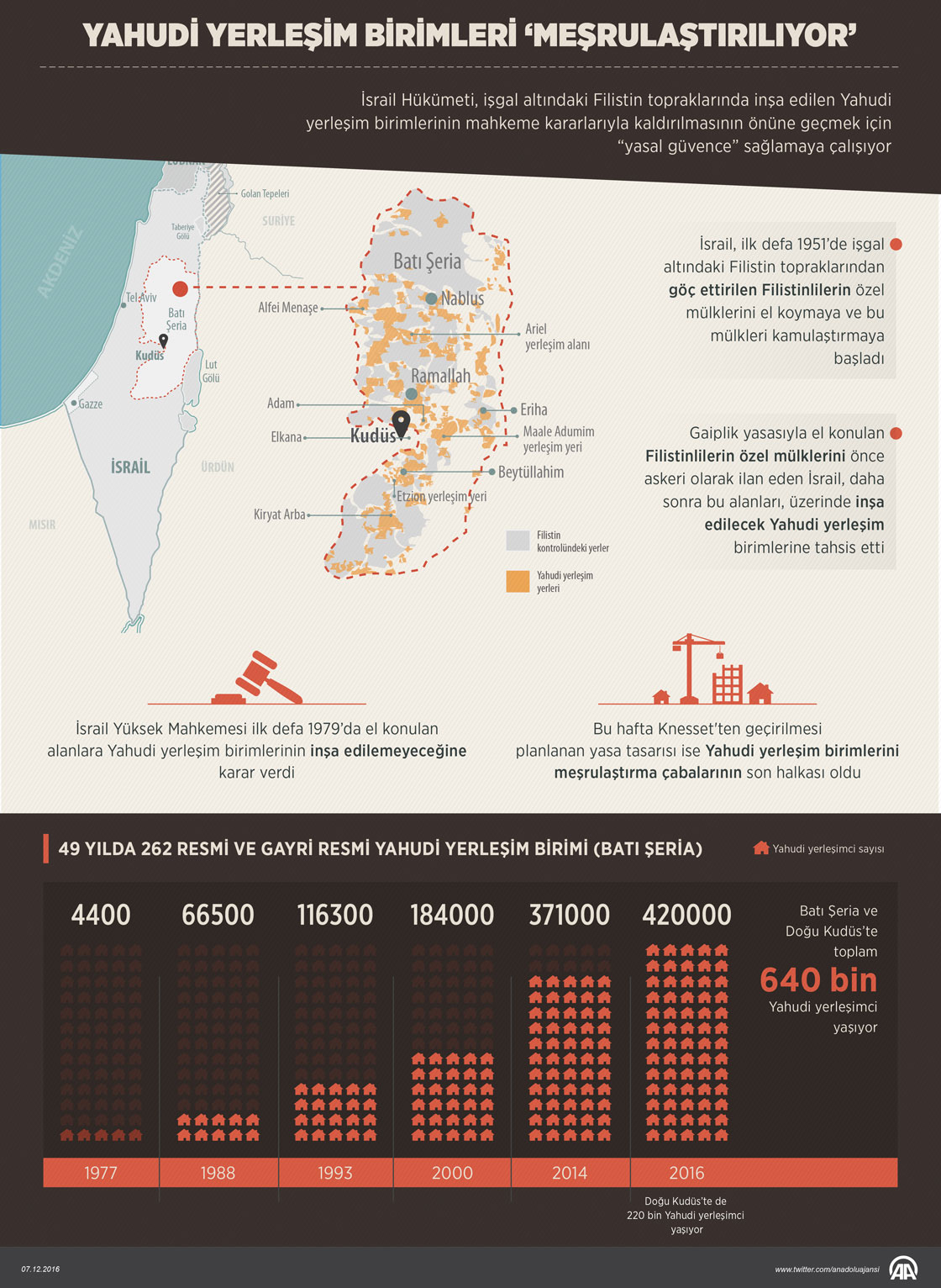 İsrail Hükümeti, işgal altındaki Filistin topraklarında inşa edilen Yahudi yerleşim birimlerinin mahkeme kararlarıyla kaldırılmasının önüne geçmek için "yasal güvence" sağlamaya çalışıyor. ( Yasin Demirci - Anadolu Ajansı )