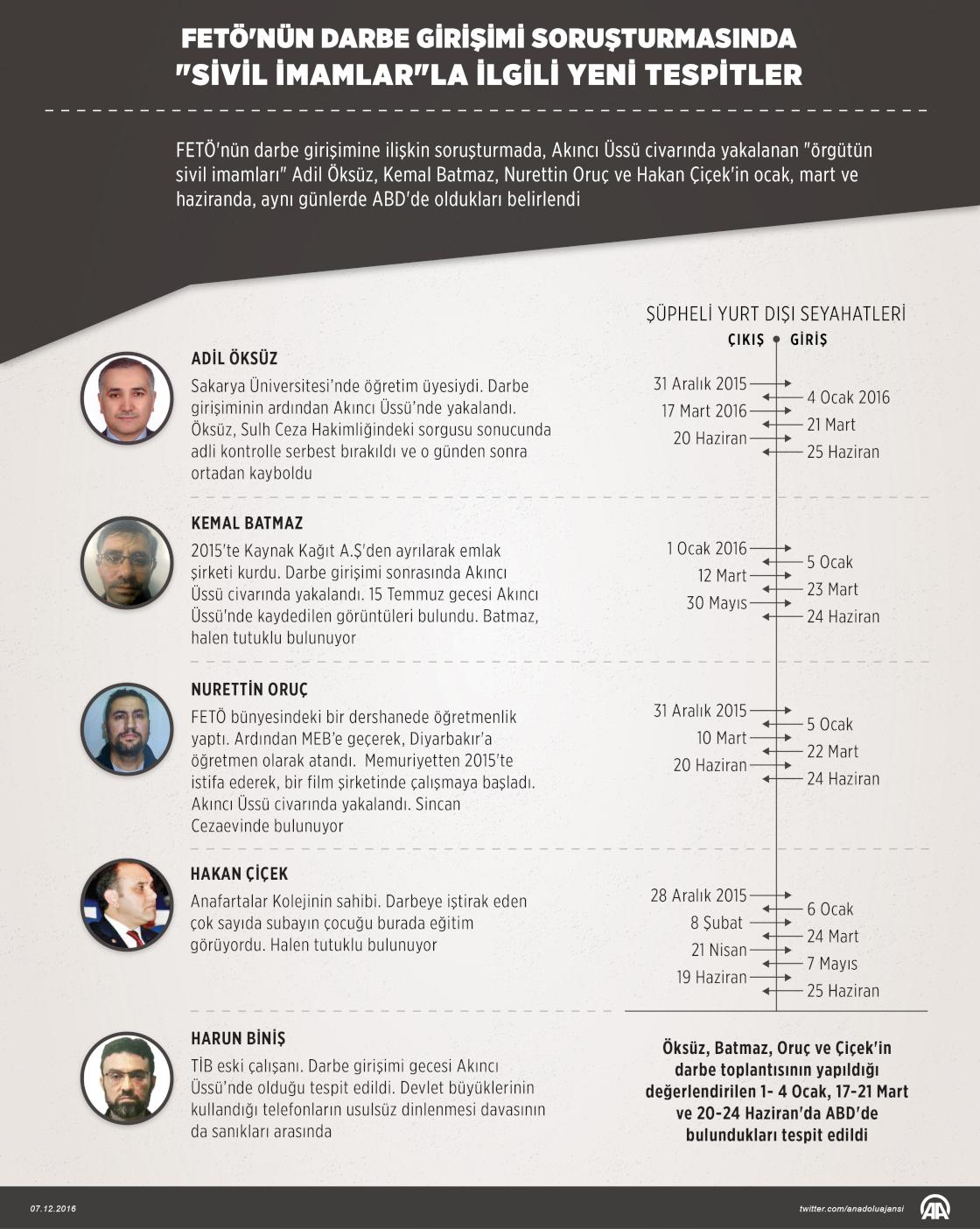 Fetullahçı Terör Örgütü'nün (FETÖ) 15 Temmuz'daki darbe girişimiyle ilgili soruşturmayı yürüten Ankara Cumhuriyet Başsavcılığı, Akıncı Üssü civarında yakalanan "örgütün sivil imamları" Adil Öksüz, Kemal Batmaz, Nurettin Oruç ve Hakan Çiçek'in ocak, mart ve haziranda, aynı günlerde ABD'de olduklarını belirledi.07 Aralık 2016•Güncelleme: 07 Aralık 2016