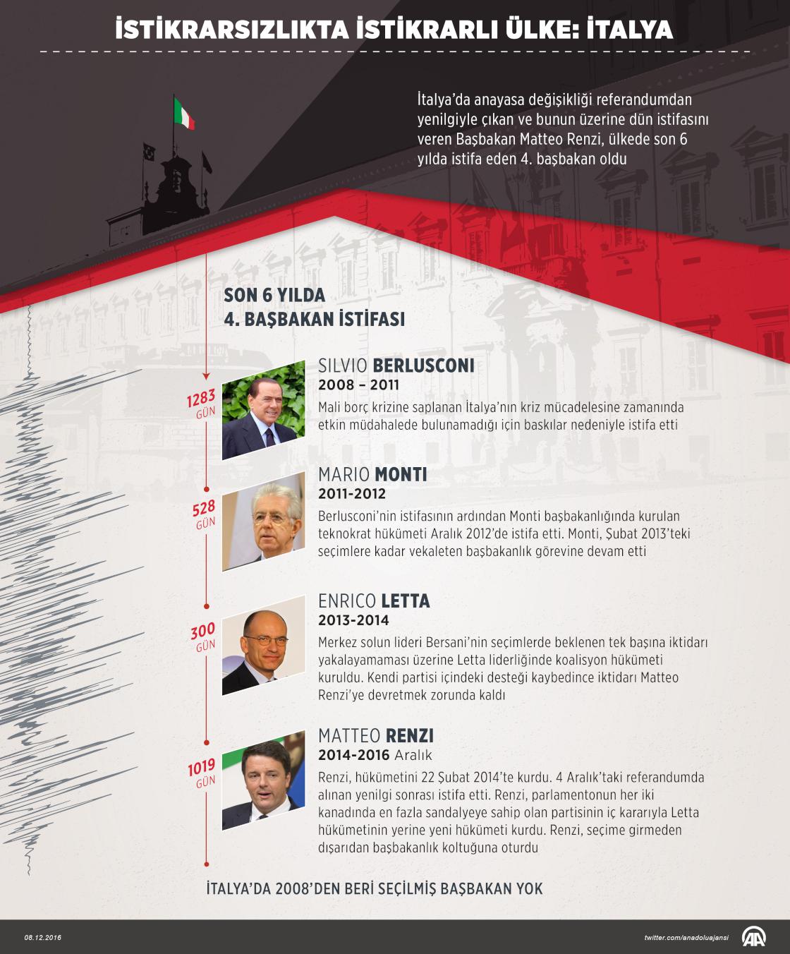 İtalya’da anayasa değişikliği referandumdan yenilgiyle çıkan ve bunun üzerine dün istifasını veren Başbakan Matteo Renzi, ülkede son 6 yılda istifa eden 4. başbakan oldu. ( Murat Usubaliev - Anadolu Ajansı )