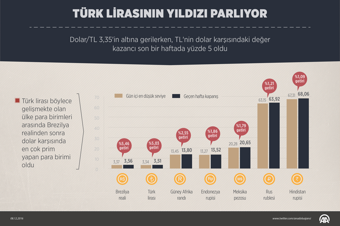 Dolar/TL 3,35'in altına gerilerken, TL'nin dolar karşısındaki değer kazancı son bir haftada yüzde 5 oldu. Türk lirası böylece gelişmekte olan ülke para birimleri arasında Brezilya realinden sonra dolar karşısında en çok prim yapan para birimi oldu. Aynı dönemde gelişmekte olan ülke para birimlerinin dolar karşısındaki hareketleri incelendiğinde; Brezilya realinin yüzde 5,5, Güney Afrika randının yüzde 2,6, Endonezya rupisinin yüzde 1,9, Meksika pesosunun yüzde 1,8 ve Rus rublesinin yüzde 1,2 değer kazandığı görüldü. ( Ahmet Burak Özkan - Anadolu Ajansı )08 Aralık 2016•Güncelleme: 08 Aralık 2016