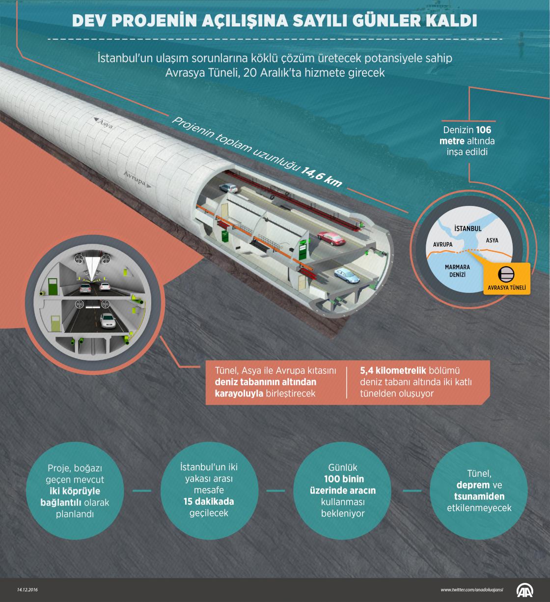 İstanbul'un ulaşım sorununa köklü çözüm üretecek potansiyele sahip Avrasya Tüneli, 20 Aralık'ta hizmete girecek. Asya ile Avrupa kıtasını deniz tabanının altından karayoluyla birleştirecek tünel, İstanbul'un iki yakası arasındaki 100 dakikalık mesafeyi 15 dakikaya indirecek. Günlük ortalama 100 binin üzerinde aracın kullanacağı tünel, deprem ve tsunamiden etkilenmeyecek. Üstün güvenlik özellikleriyle sığınak olarak da kullanılabilecek tünelde, yangına dayanıklı yüzey kaplaması ve acil tahliye sistemleri bulunacak. ( Ahmet Burak Özkan - Anadolu Ajansı )14 Aralık 2016•Güncelleme: 14 Aralık 2016