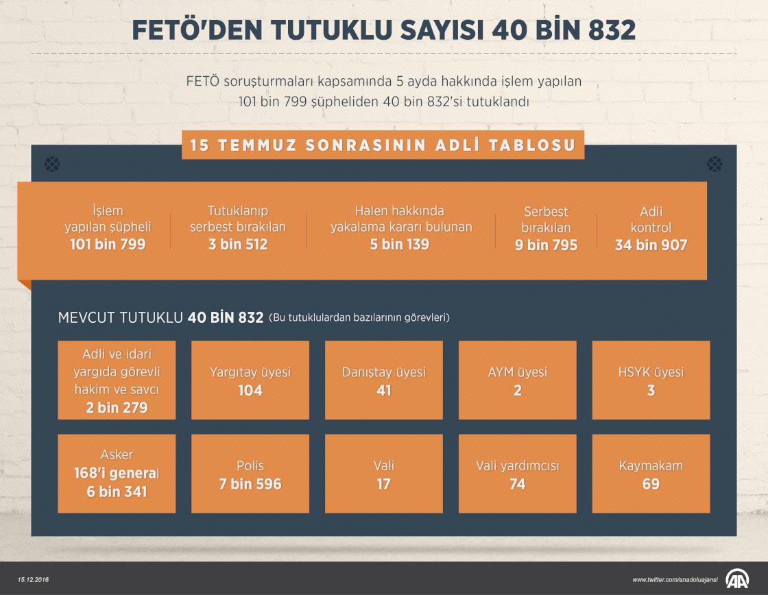 Fetullahçı Terör Örgütü'nün (FETÖ) 15 Temmuz darbe girişimi sonrasında başlatılan soruşturmalar kapsamında 40 bin 832 şüpheli tutuklu bulunuyor.