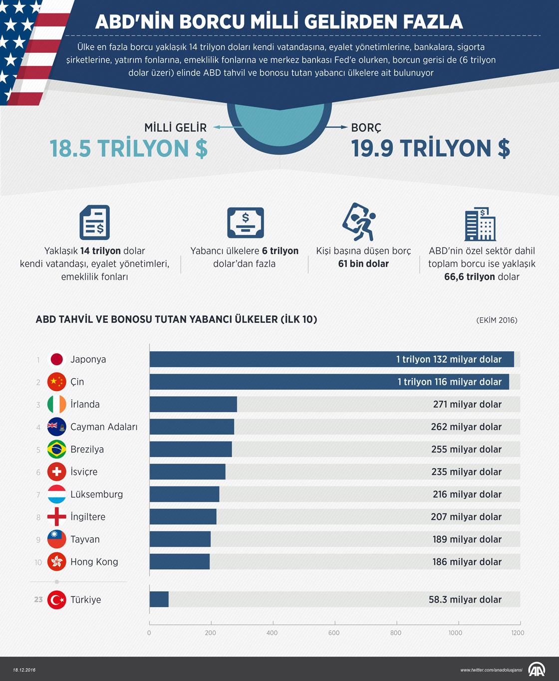 ABD'nin yıllık 18,5 trilyon dolarlık milli gelirine karşın özel sektör hariç 19,9 trilyon dolar borcu var. Türkiye’nin rezervlerinde 58,3 milyar dolar değerinde ABD tahvil ve bonosu bulunuyor. Ülkenin borcunun en büyük kesimini yaklaşık 14 trilyon dolarla kendi vatandaşına, eyalet yönetimlerine, bankalara, sigorta şirketlerine, yatırım fonlarına, emeklilik fonlarına ve merkez bankası Fed'e olan borçlar, gerisini ise (6 trilyon dolar üzeri) elinde ABD tahvil ve bonosu tutan yabancı ülkelere olan borçlar oluşturuyor. ( Ahmet Burak Özkan - Anadolu Ajansı )18 Aralık 2016•Güncelleme: 18 Aralık 2016