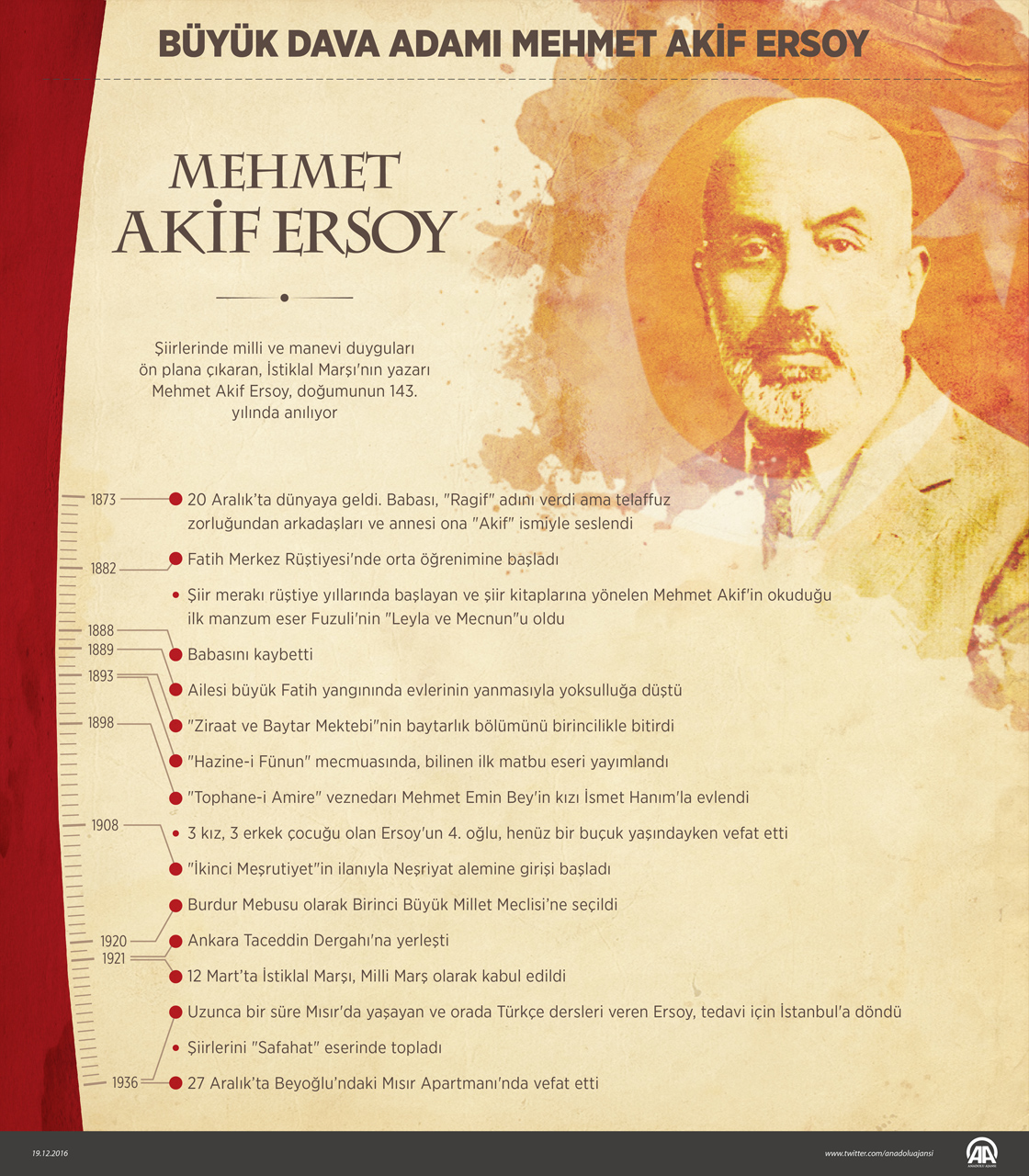 Şiirlerinde milli ve manevi duyguları ön plana çıkaran, İstiklal Marşı şairi Mehmet Akif Ersoy doğumunun 143. yılında anılıyor.