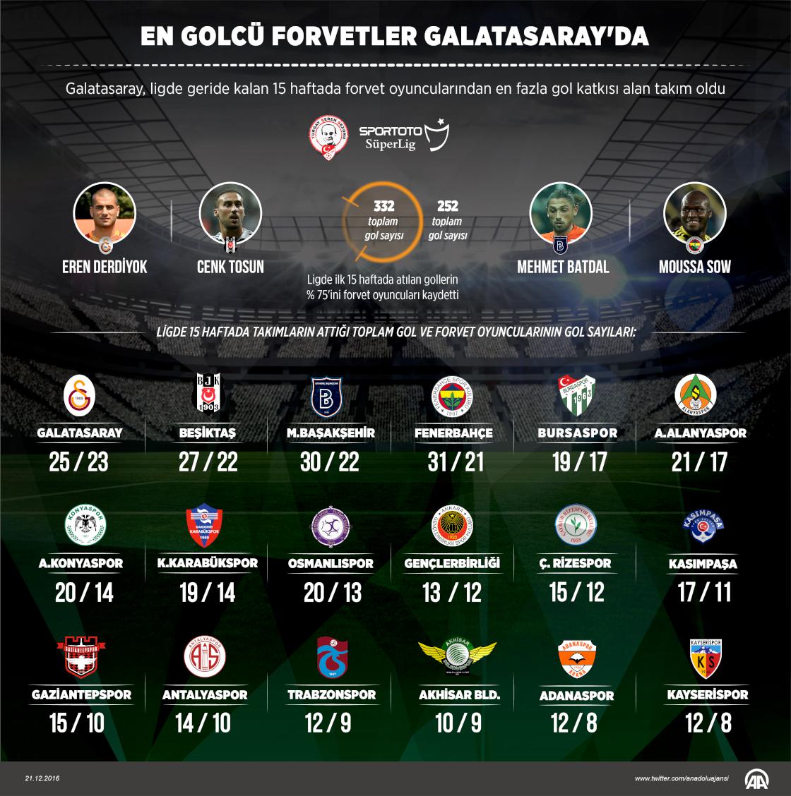 Galatasaray, Spor Toto Süper Lig'de geride kalan 15 haftada forvet oyuncularından en fazla gol katkısı alan takım oldu. Süper Lig'in ilk 15 haftasında 25 gol atan sarı-kırmızılı takımda, 23 gol üreten hücum oyuncuları, aynı bölgedeki meslektaşlarına oranla ön plana çıktı. Grafik: AA/Muhammed Ali Yiğit