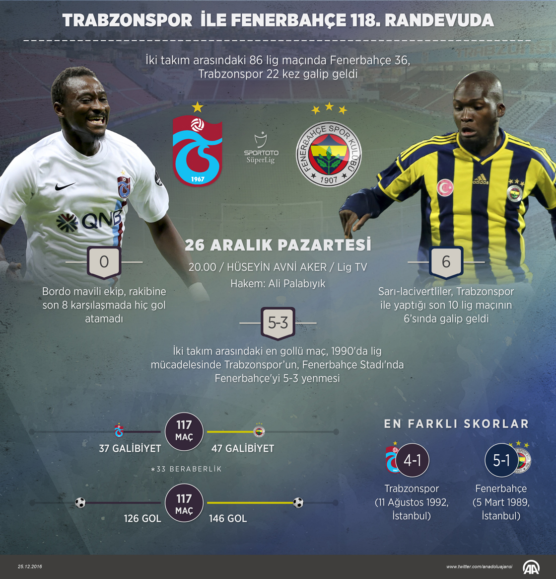 Spor Toto Süper Lig'de yarın yapacakları maçla birlikte Fenerbahçe ile Trabzonspor 118. kez karşı karşıya gelecek.