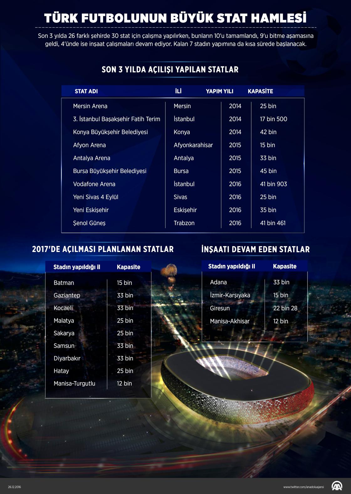 Dünyada uluslararası organizasyonlara ev sahipliği hakkı kazanan birçok ülke stat yapımı konusunda büyük sıkıntılar yaşarken, Türkiye herhangi büyük bir turnuvayı düzenlememesine karşın 30 stadın inşasıyla ilgili aynı anda hamlede bulunuyor. Türk futbolu, son yıllarda arka arkaya açılışları yapılan modern statlarıyla farklı bir çehreye bürünüyor. Birçok şehirde taraftarların rahat bir şekilde takımlarını destekleyebileceği, UEFA standartlarındaki statlar ardı ardına kapılarını açıyor. ( Gözde Gültekinler - Anadolu Ajansı )26 Aralık 2016•Güncelleme: 26 Aralık 2016