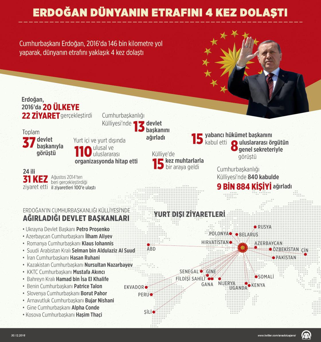 Cumhurbaşkanı Erdoğan, 2016 yılında 146 bin kilometre yol yaparak, dünyanın etrafını yaklaşık 4 kez dolaştı. 15 Temmuz darbe girişimi sonrası ilk yurt dışı ziyaretini Rusya'ya gerçekleştiren Cumhurbaşkanı Erdoğan, toplam 37 devlet başkanıyla bir araya geldi, 15 yabancı hükümet başkanını da kabul etti. ( Murat Usubaliev - Anadolu Ajansı )30 Aralık 2016•Güncelleme: 30 Aralık 2016