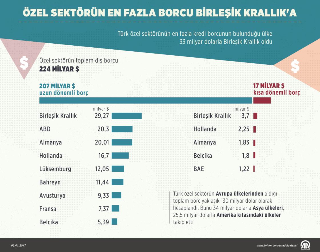 Türk özel sektörünün kısa ve uzun vadeli dış borcu, geçen yıl ekim sonu itibarıyla 224 milyar doları aşarken, bunun 130 milyar doları Avrupa'dan alınan borçlardan oluştu. 33 milyar dolarlık borç bulunan İngiltere, Galler, İskoçya ve Kuzey İrlanda'nın içinde bulunduğu Birleşik Krallık ise bu alanda ilk sırada yer aldı. ( Murat Usubaliev - Anadolu Ajansı )02 Ocak 2017•Güncelleme: 02 Ocak 2017