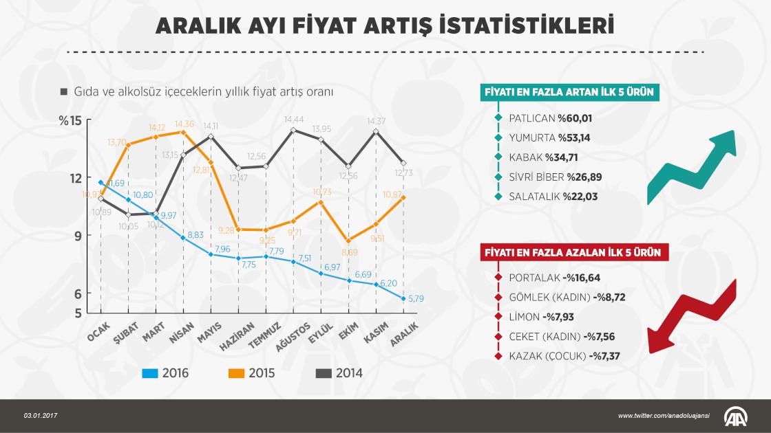 Türkiye İstatistik Kurumu (TÜİK) verilerine göre, tüketici fiyatları bazında aralıkta en yüksek fiyat artışı, yüzde 60,01 ile patlıcanda gözlendi. Patlıcandaki fiyat artışını, yüzde 53,14 ile yumurta, yüzde 34,71 ile kabak izledi. Geçen ay en fazla fiyat düşüşü ise yüzde 16,64 ile portakalda gerçekleşti.