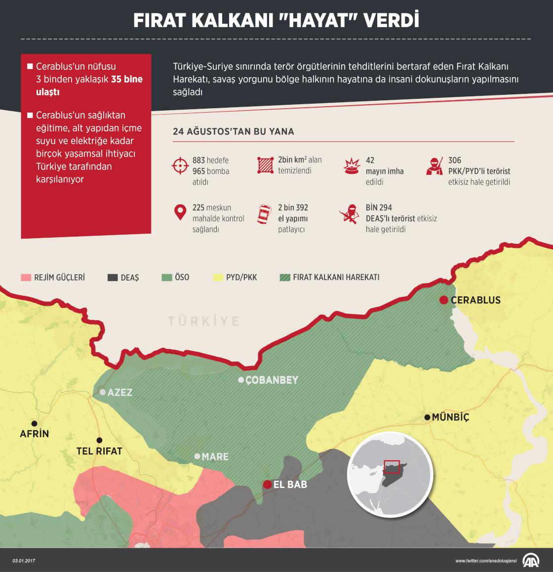 Türkiye-Suriye sınırında, terör örgütleri DEAŞ ve PYD/PKK tehdidine karşı başlatılan Fırat Kalkanı Harekatı'nda geride kalan 4 ayda, yaklaşık bin 900 kilometrekare alan terör örgütlerinden temizlenirken Türkiye Cumhuriyeti'nin destekleriyle bölge halkına insani yaşam şartlarının sağlandığı bir hayat imkanı sunuldu. ( Yasin Demirci - Anadolu Ajansı )03 Ocak 2017•Güncelleme: 03 Ocak 2017