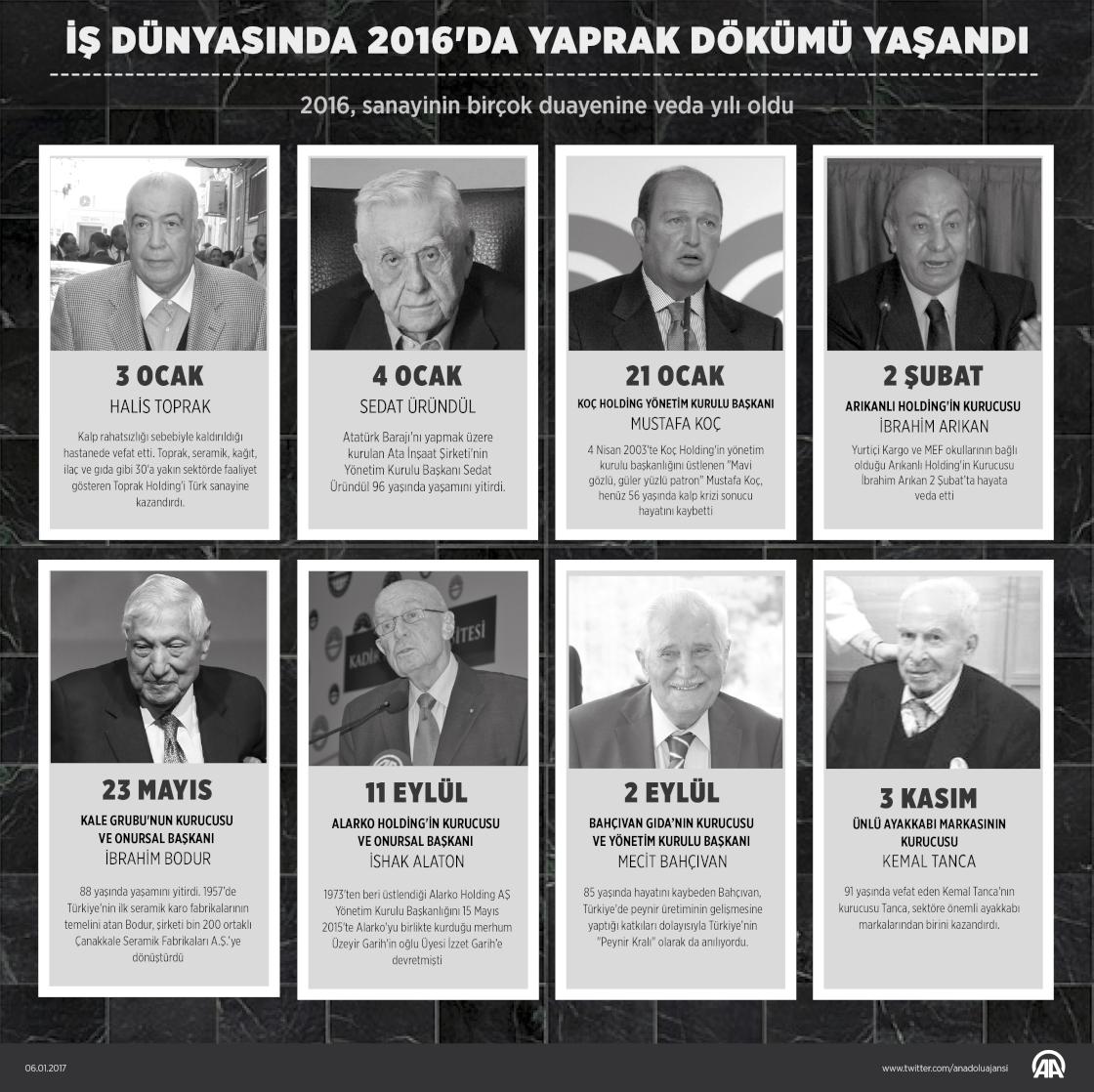 Başta sanayi alanında olmak üzere geçen yıl çok sayıda duayenini kaybeden Türk iş dünyası, adeta yaprak dökümü yaşadı. İş dünyasındaki yaprak dökümü, çevresinde "Halis Ağa" olarak tanınan Halis Toprak'ın 3 Ocak'taki vefatıyla başladı, bir gün sonra 96 yaşındaki iş adamı Sedat Üründül'ün hayatını kaybetmesiyle de devam etti. 4 Nisan 2003'te Koç Holding'in yönetimini babası Rahmi Koç'tan devralan Mustafa Koç ise 21 Ocak'ta, henüz 56 yaşında sonsuzluğa uğurlandı. ( Gözde Gültekinler - Anadolu Ajansı )06 Ocak 2017•Güncelleme: 06 Ocak 2017