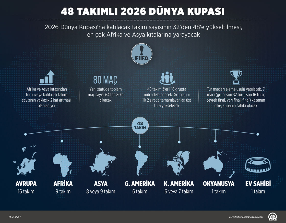 2026 Dünya Kupası'nın formatında yapılan değişiklik, özellikle Afrika ve Asya gibi kıtaların turnuvada daha fazla ülkeyle temsil edilmesine ön ayak olacak. FIFA Konseyi tarafından alınan kararla Dünya Kupası'na katılacak takım sayısının 2026'dan itibaren 32'den 48'e yükseltilmesi, futbolda gelişmekte olan bir çok ülkenin turnuvada daha fazla yer almasını sağlayacak. Organizasyonun devam eden statüsünde görece az kontenjana sahip Afrika ve Asya kıtalarında yer alan takım sayısında, 2026 Dünya Kupası'ndan itibaren ciddi bir artış yaşanması bekleniyor.