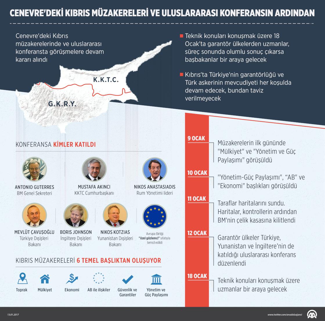 Cenevre'deki Kıbrıs müzakerelerinde ve uluslararası konferansta görüşmelere devam kararı alındı. Teknik konuları konuşmak üzere 18 Ocak'ta garantör ülkelerden uzmanlar, süreç sonunda olumlu sonuç çıkarsa başbakanlar bir araya gelecek. Kıbrıs'ta Türkiye'nin garantörlüğü ve Türk askerinin mevcudiyeti her koşulda devam edecek, bundan taviz verilmeyecek. ( Yasin Demirci - Anadolu Ajansı )13 Ocak 2017•Güncelleme: 13 Ocak 2017